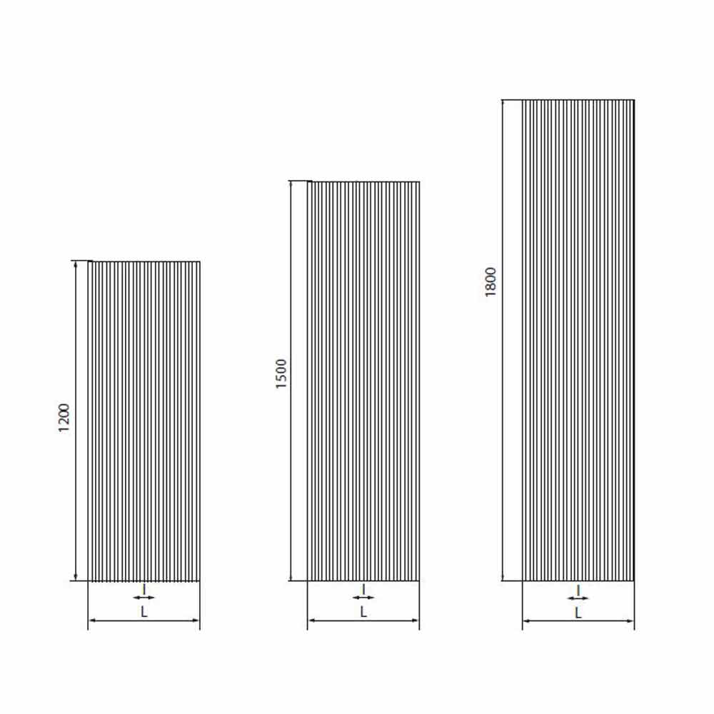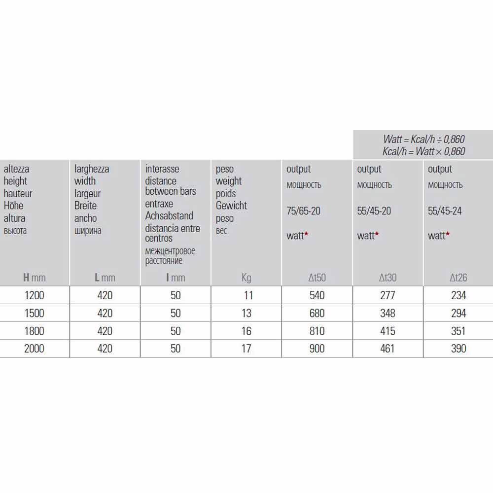 • H 1200 x L 420 x Inter. 50 mm x Salida w (Δt50 *) 540; Rendimiento w (Δt30 *) 277; Rendimiento w (Δ26 *) 234;