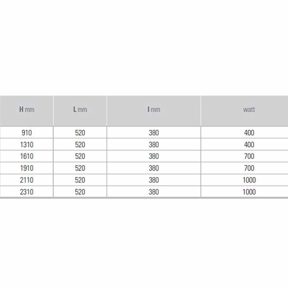 - H 1200 x L 520 x Inter. 450 x P 65 mm x Salida w 400
