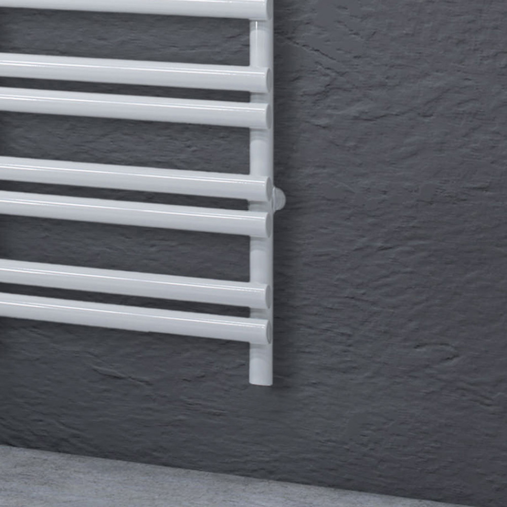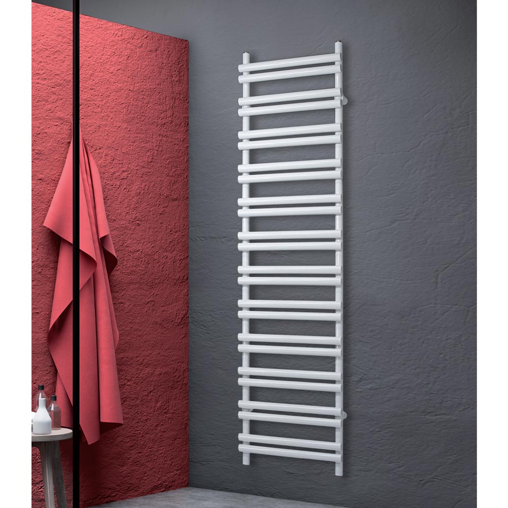 Secatoallas eléctrico en acero al carbono con acabado blanco puro brillo con elementos horizontales y colectores verticales íntegramente fabricado en Italia con kit de fijación a pared incluido . Kit de electrificación situado en la parte inferior derecha.