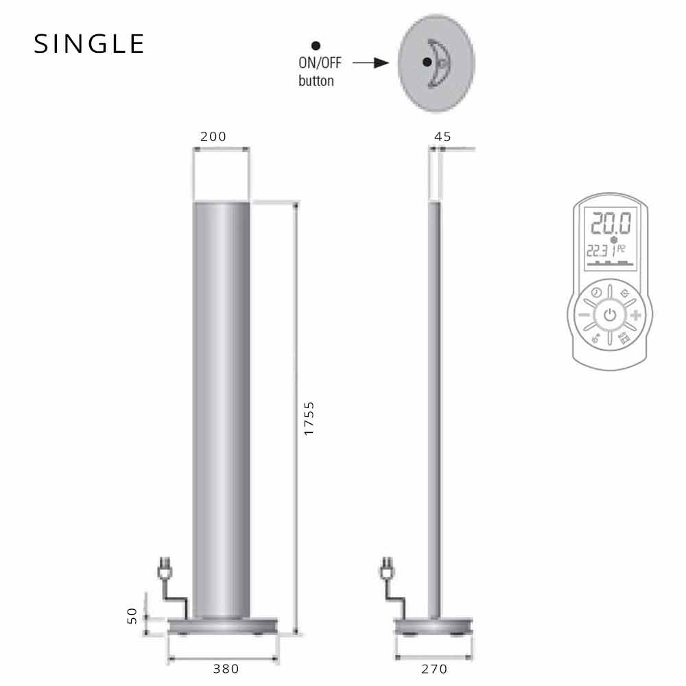 Este calentador tiene 250 vatios de potencia para la versión simple y 500 vatios para la versión doble, suministrado con control remoto estándar para ajustar las luces LED y el termostato con programación diaria / semanal. Cable de 1,5 metros con enchufe schuko. Fuente de alimentación monofásica de 230 voltios.