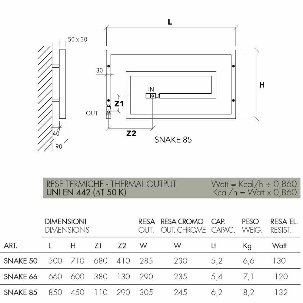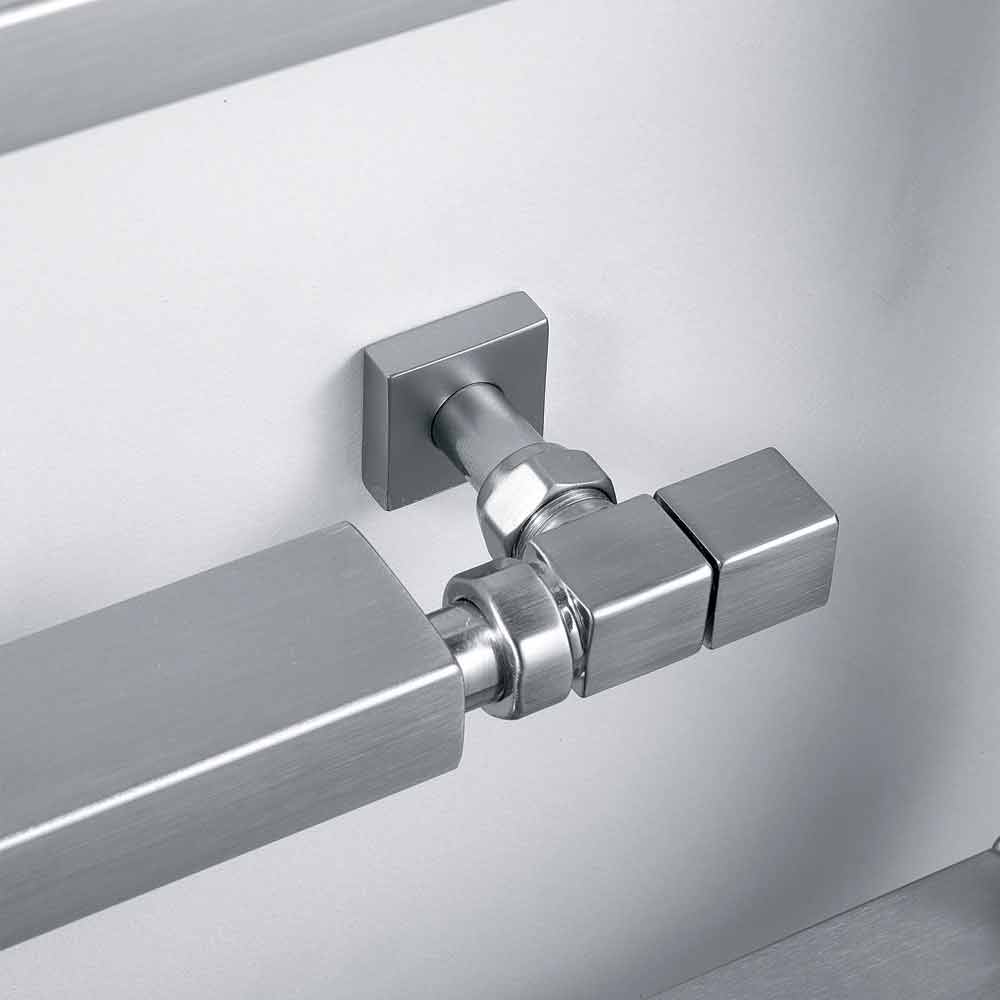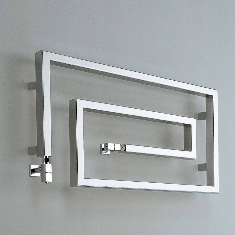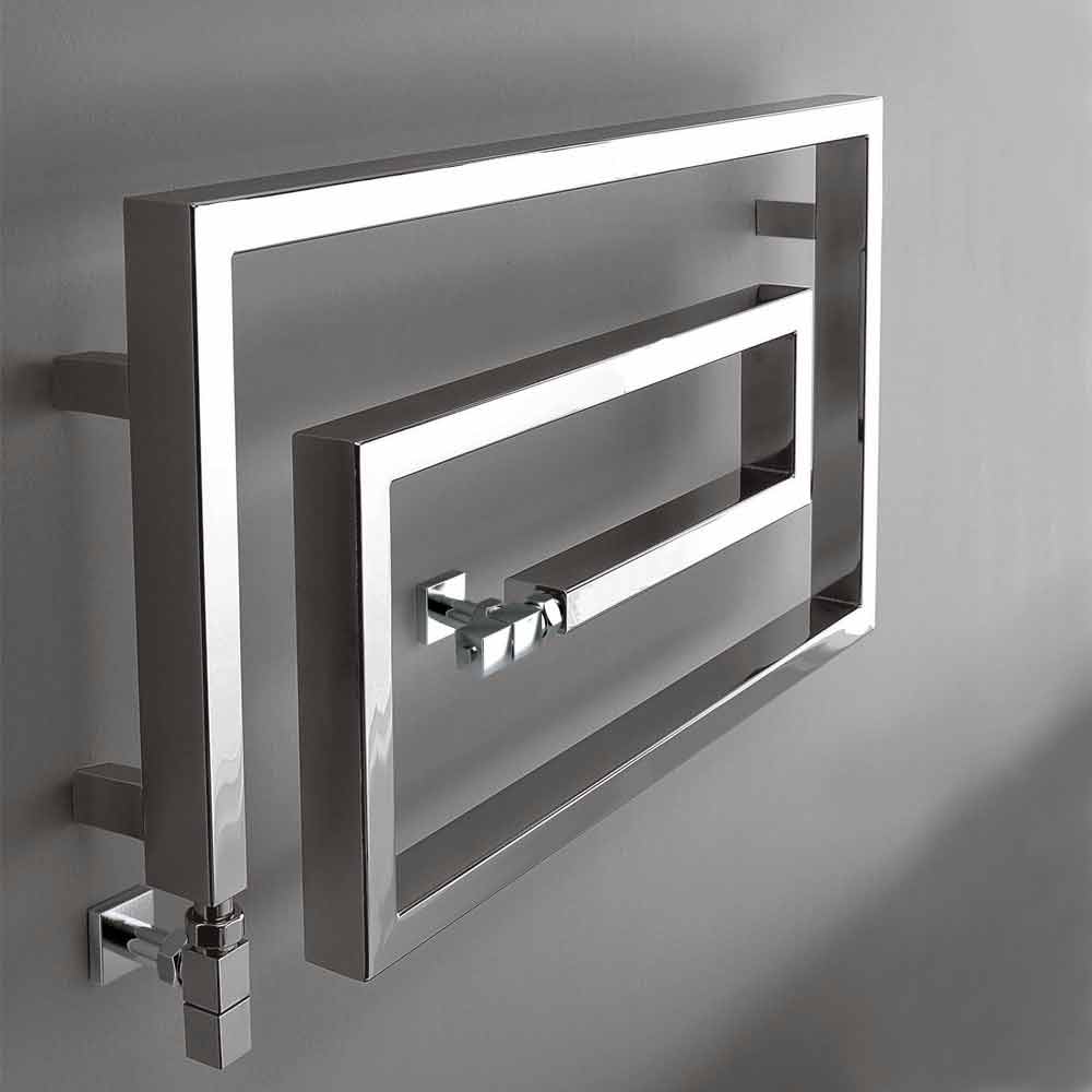 Radiador de acero cromado, en versión hidráulica. Una colección con un fuerte signo gráfico. La forma, el material, la función y la tecnología ya no crean simples calentadores de toallas, sino auténticos elementos de decoración.