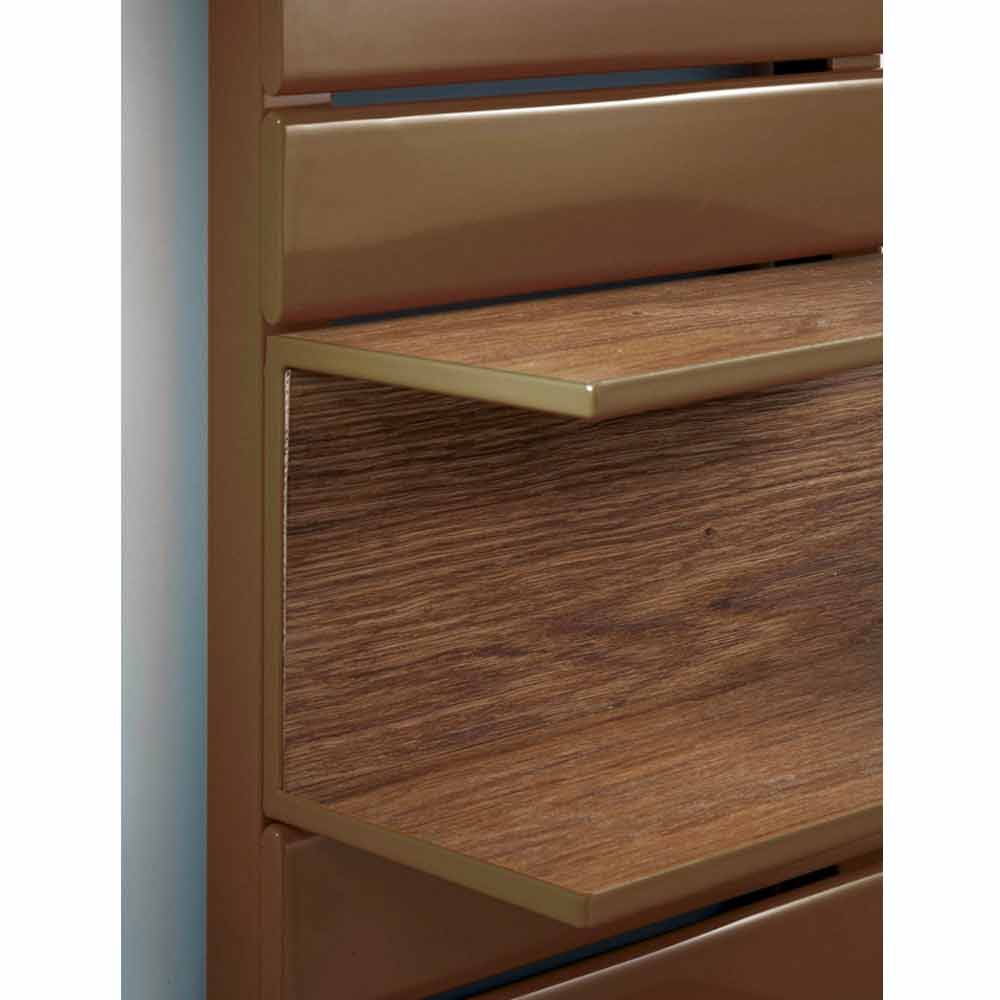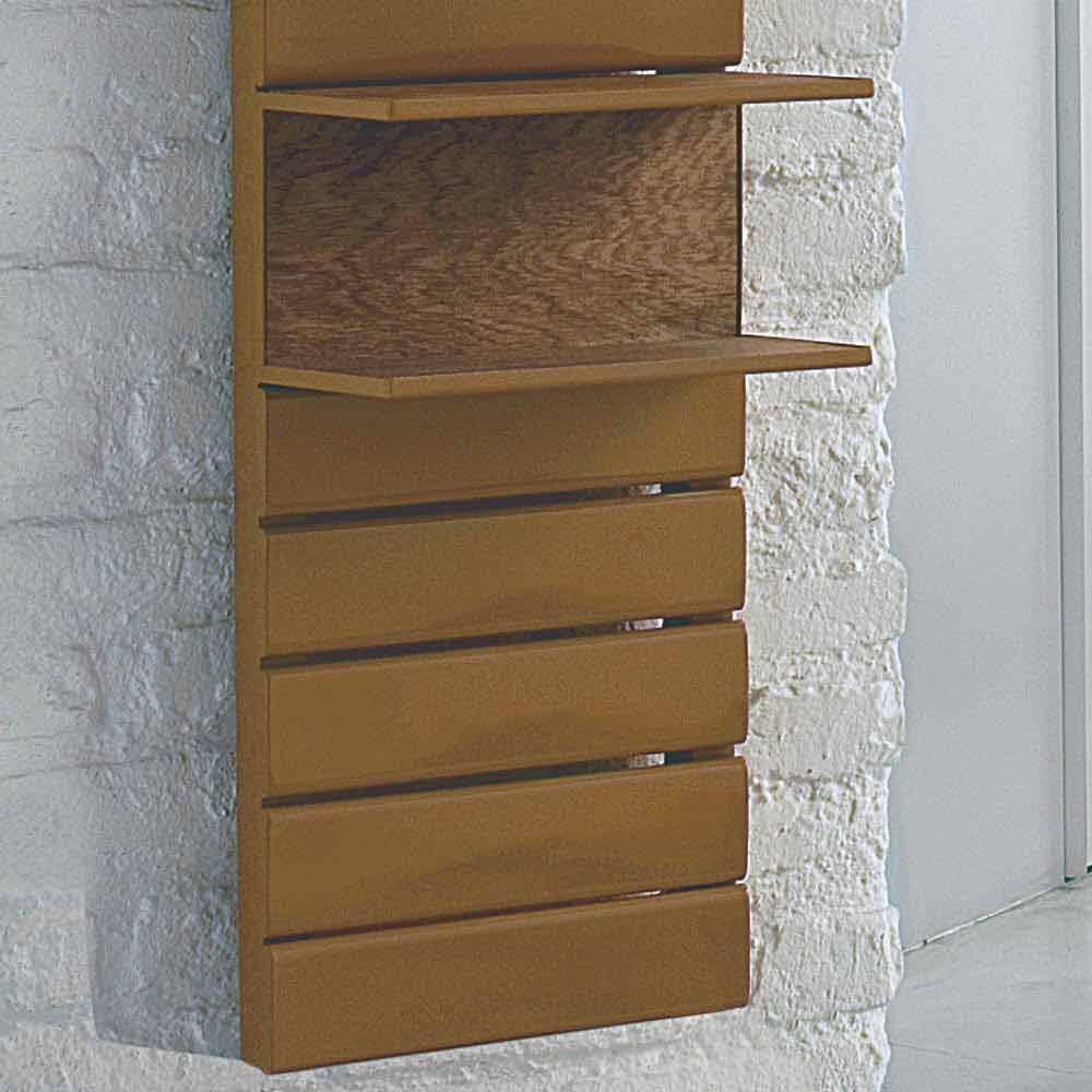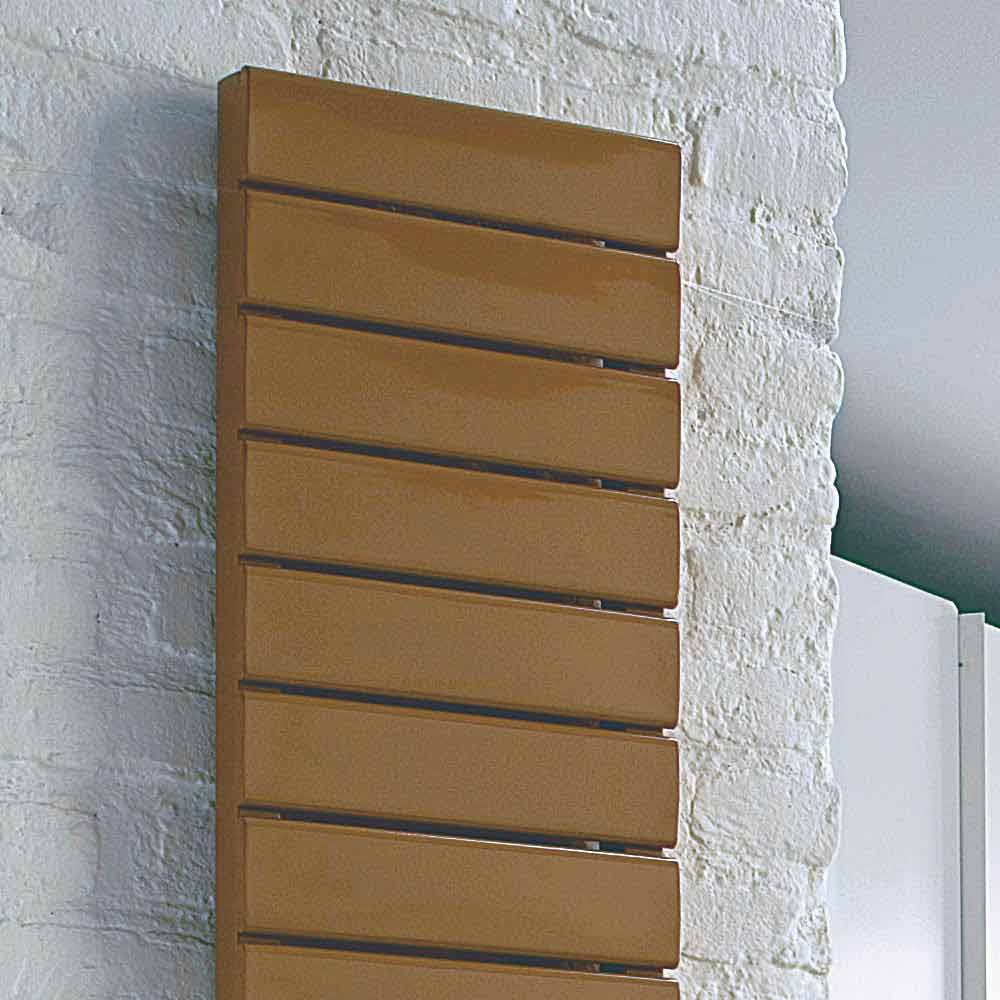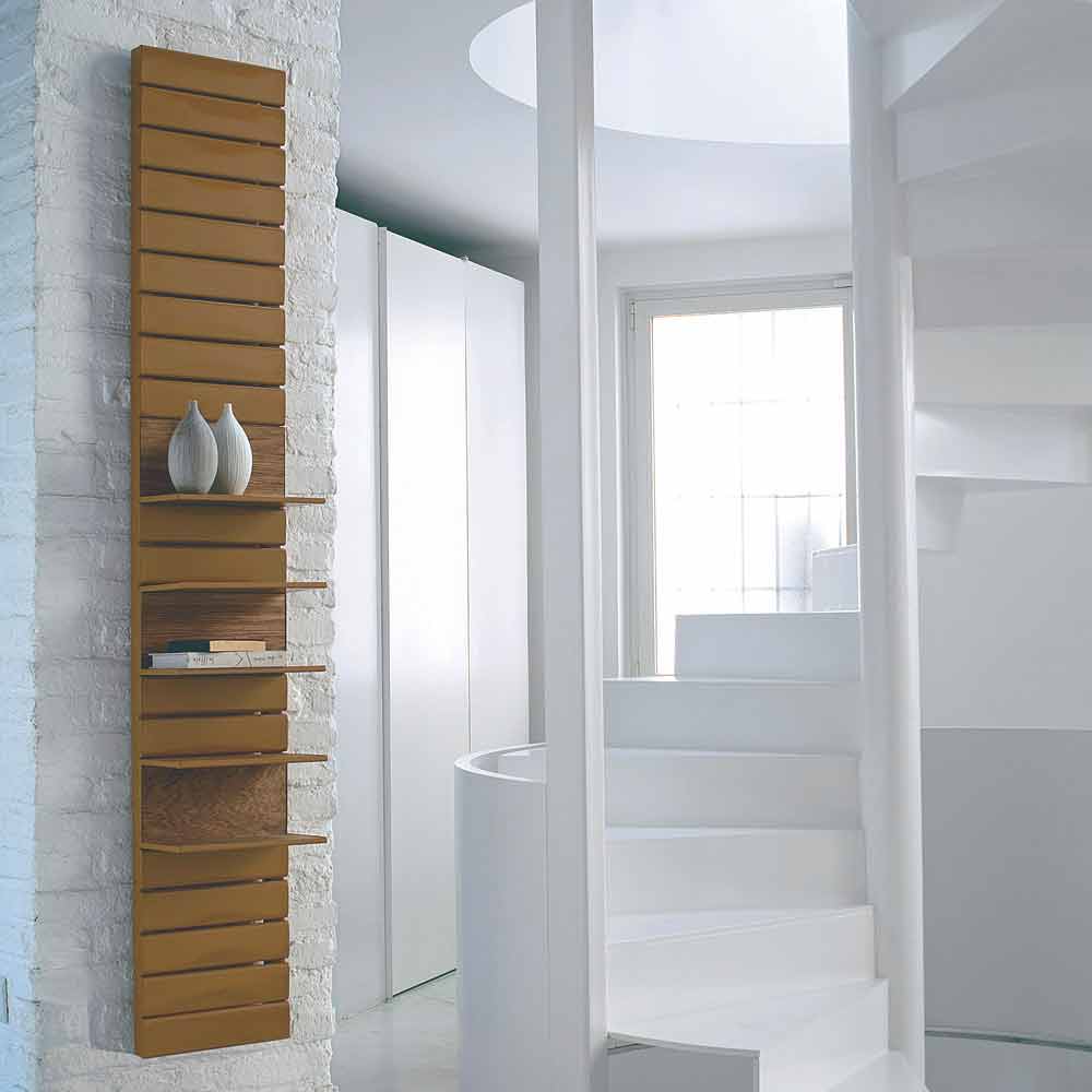 Radiador hidráulico, práctico y funcional con un diseño lineal, calienta y organiza cada ambiente en el que se inserta. Radiador vertical de acero coloreado, completo de estantes (como en la foto) con respaldo-baldas y tapa de roble natural.