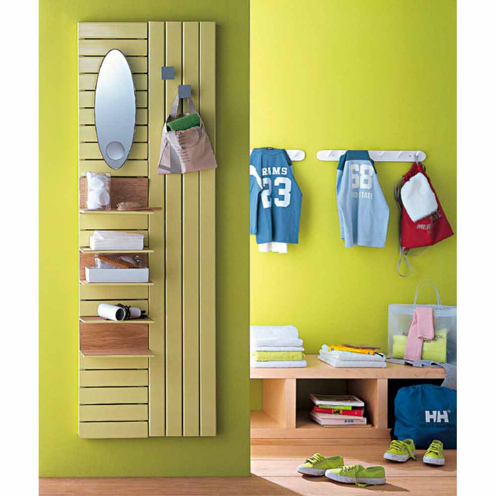Radiador hidráulico, práctico y funcional con un diseño lineal, calienta y organiza cada ambiente en el que se inserta. Radiador vertical de acero coloreado, completo de estantes (como en la foto) con respaldo-baldas y tapa de roble natural.