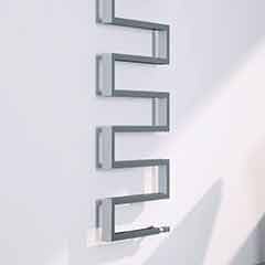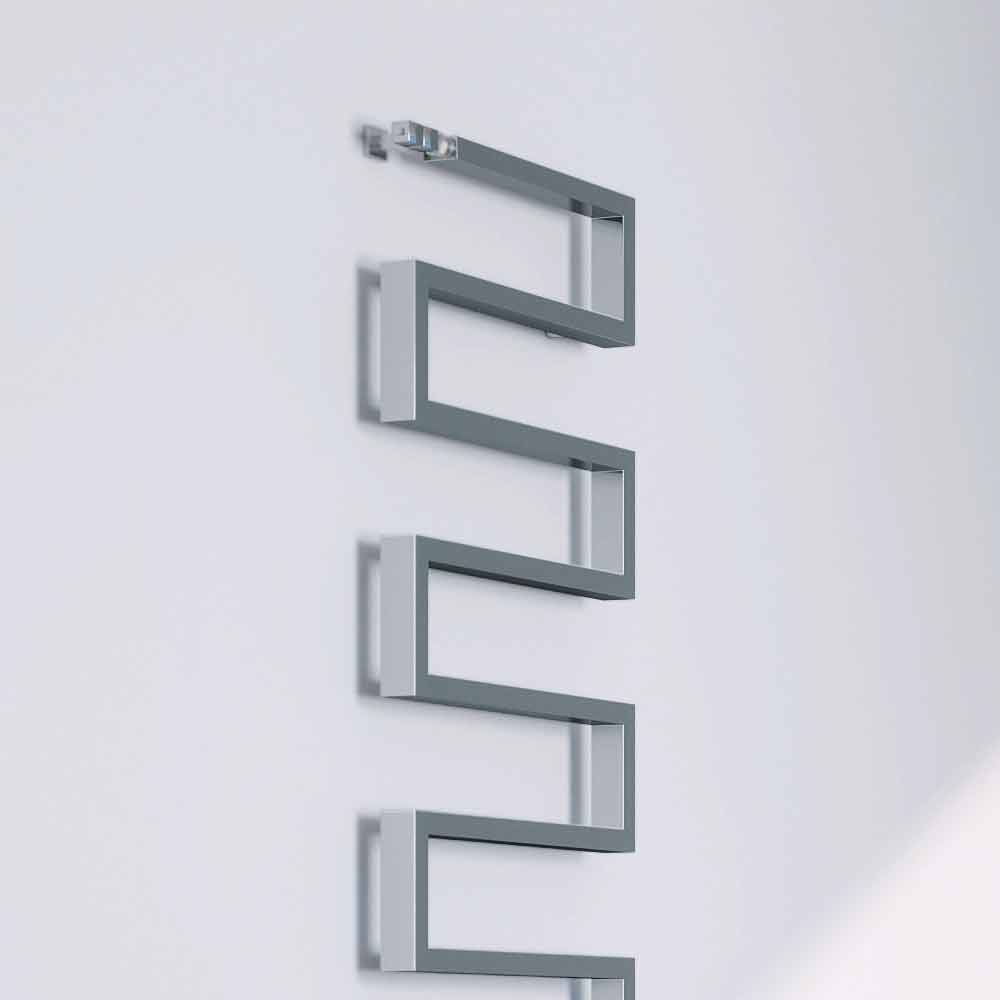 Radiador vertical en acero cromado, en versión hidráulica. Una colección con un fuerte signo gráfico. La forma, el material, la función y la tecnología ya no crean simples calentadores de toallas, sino auténticos elementos de decoración.