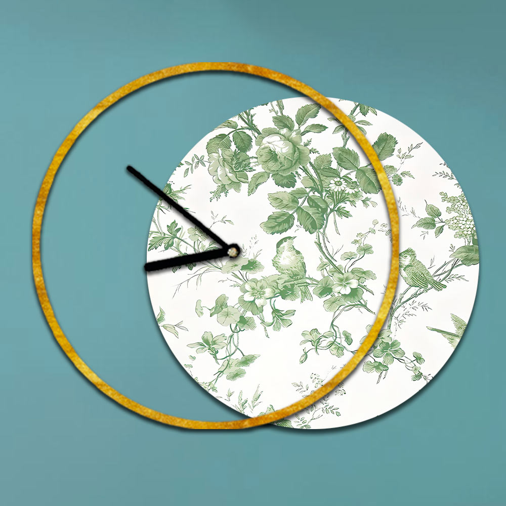 - Reloj de pan de oro y estampado con ramas y pájaros en tonos verdes.
