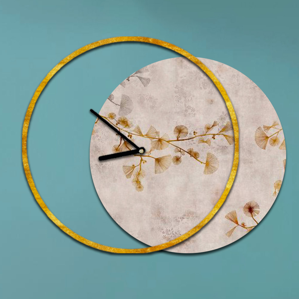- Reloj en pan de oro y estampado con ramas y flores en tonos rosa/ocre.
