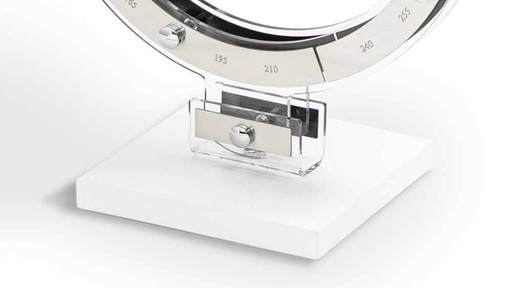 El soporte es en metacrilato, latón cromado y MDF laccato.Possibilità inclinación y rotación de corte manuale.Il y grabado se realizan con alta tecnología, instrumentos computarizados.