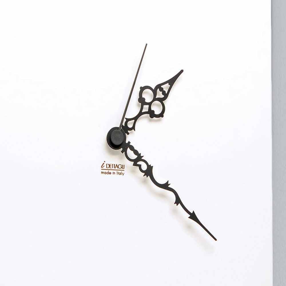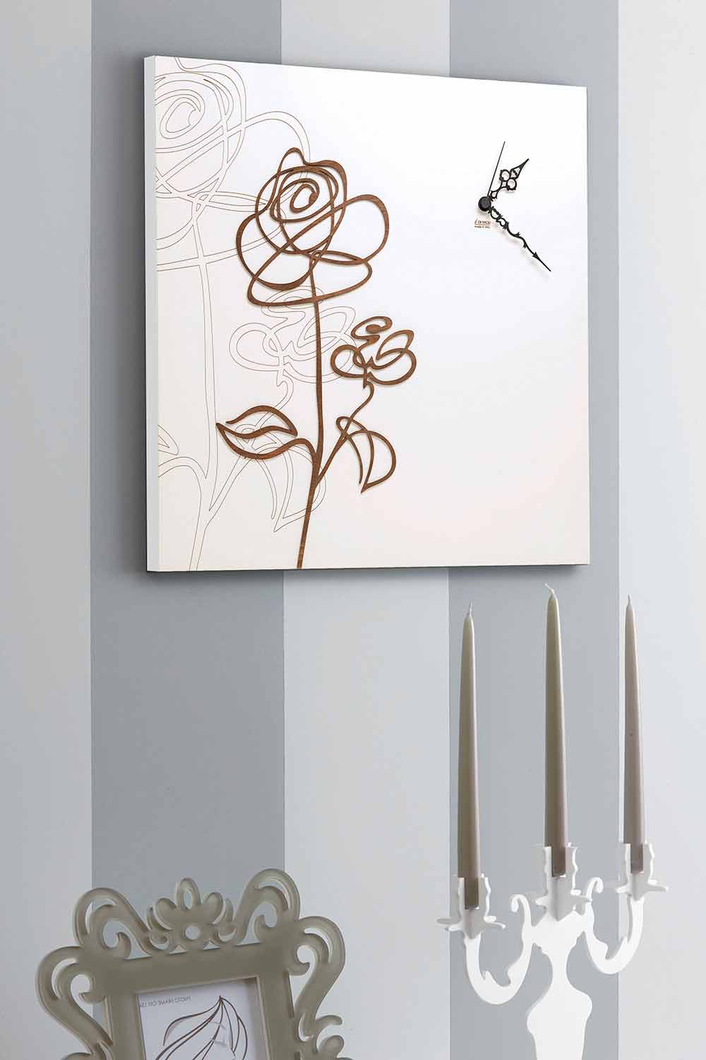Reloj de pared cuadrado en madera blanca con decoración floral en madera oscura, diseño moderno hecho en Italia.