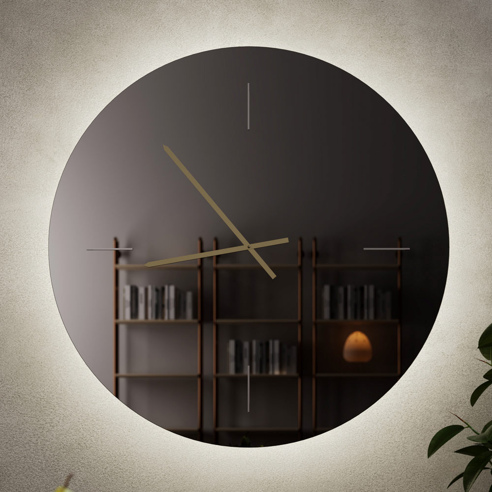 Las finas y esenciales agujas de latón satinado resaltan con elegancia sobre el fondo ahumado, creando un contraste refinado y armonioso. Su diseño minimalista, sin elementos superfluos, convierte a este reloj en un auténtico objeto decorativo capaz de realzar salones, comedores, oficinas ejecutivas y espacios contract modernos.