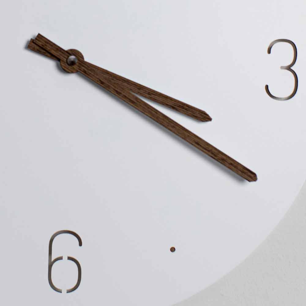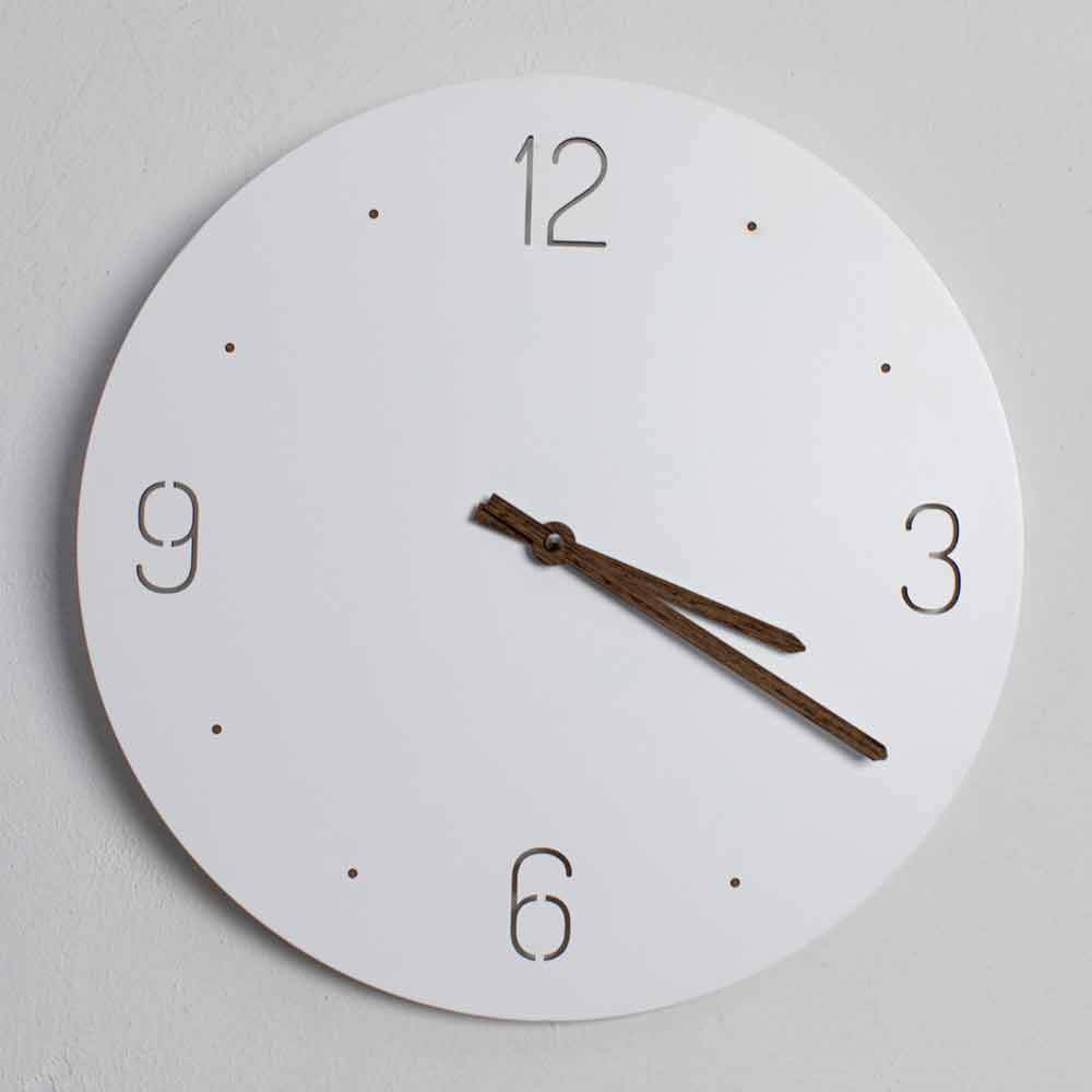 Reloj de pared redondo y de diseño básico en madera lacada en blanco y corte láser, hecho en Italia.