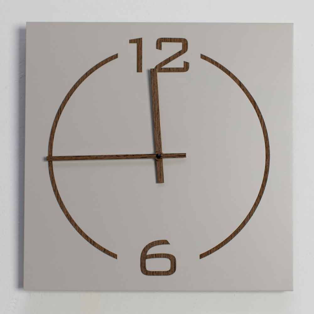 Reloj de pared de diseño moderno y redondo en madera lacada en color beige y decoraciones y agujas de nogal, hecho en Italia.