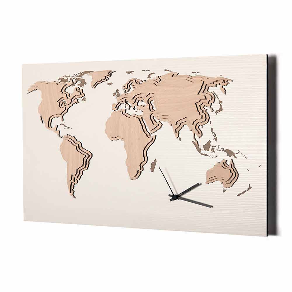 Reloj de pared rectangular de madera con mapamundi decorativo, fabricado en Italia.