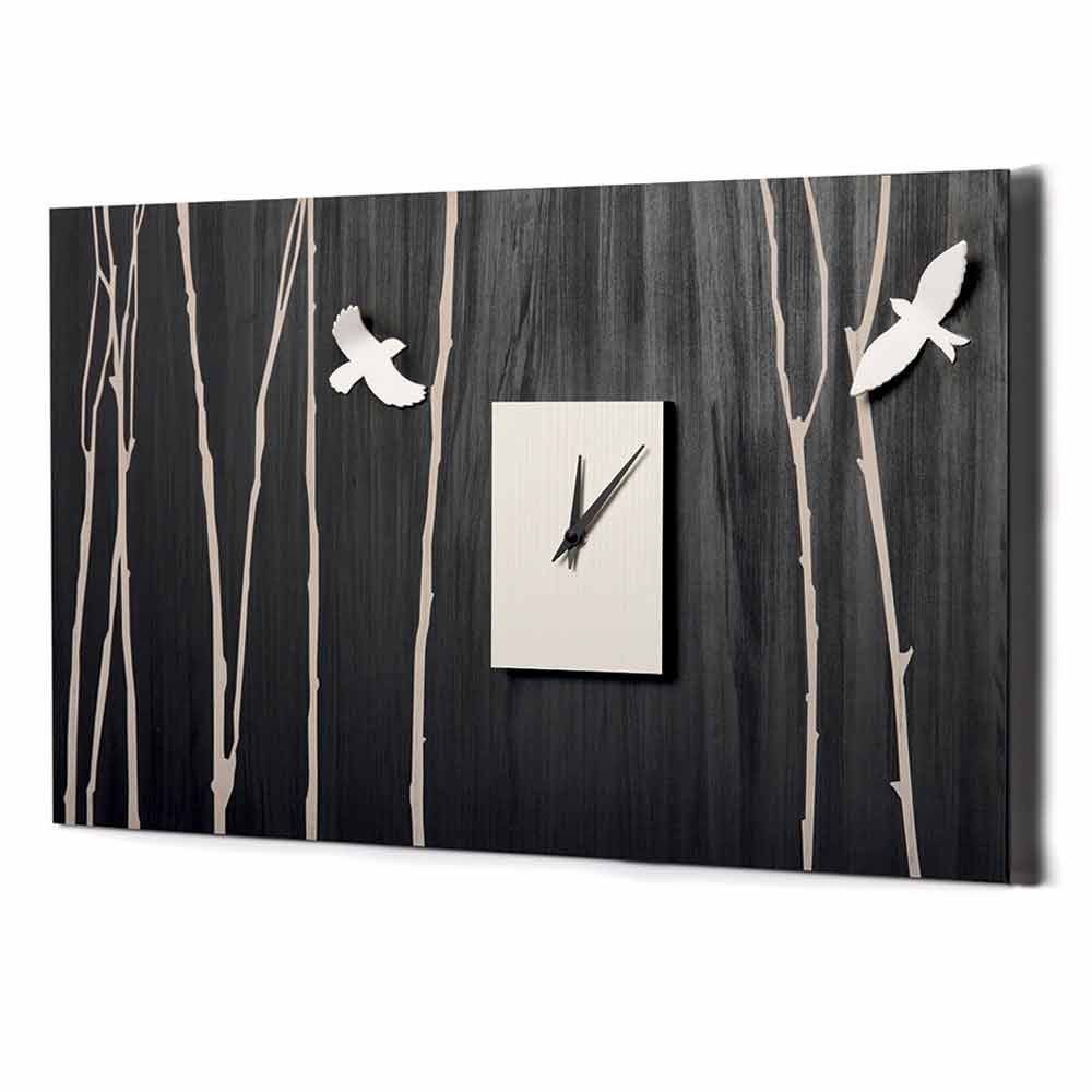 Este reloj de pared está hecha de madera de color pizarra con la representación de las ramas de invierno marcadas con láser y decoraciones tridimensionales, como la casa del pájaro de madera y las aves en metacrilato opaco.