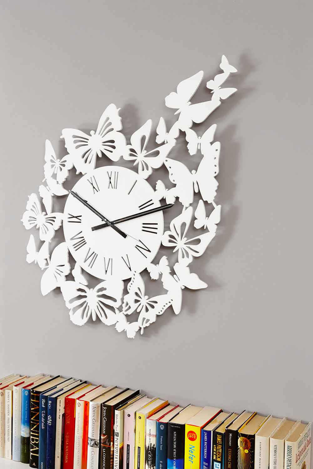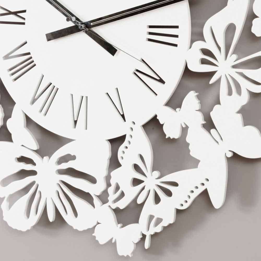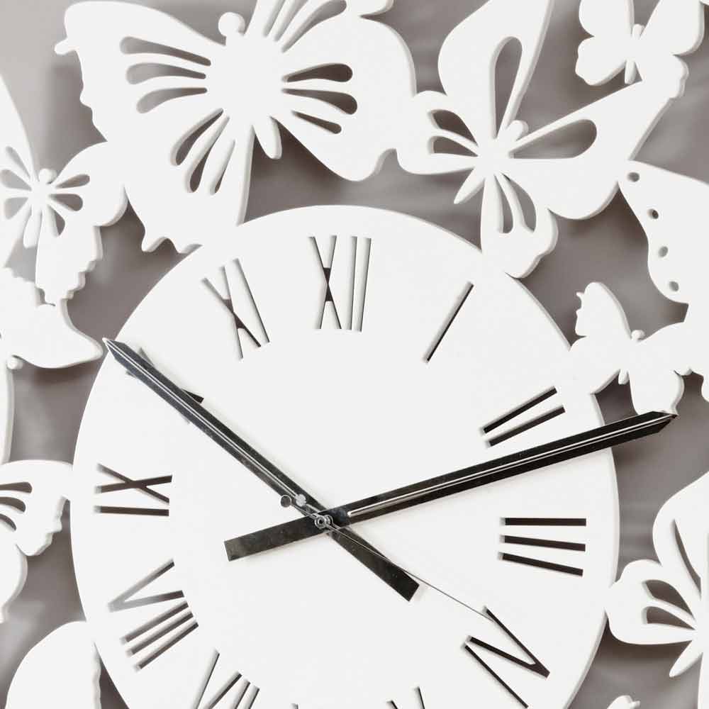 Gran reloj de pared en madera blanca, negra, gris pardo, beige o marrón, diseño redondo con mariposas fabricadas en Italia.