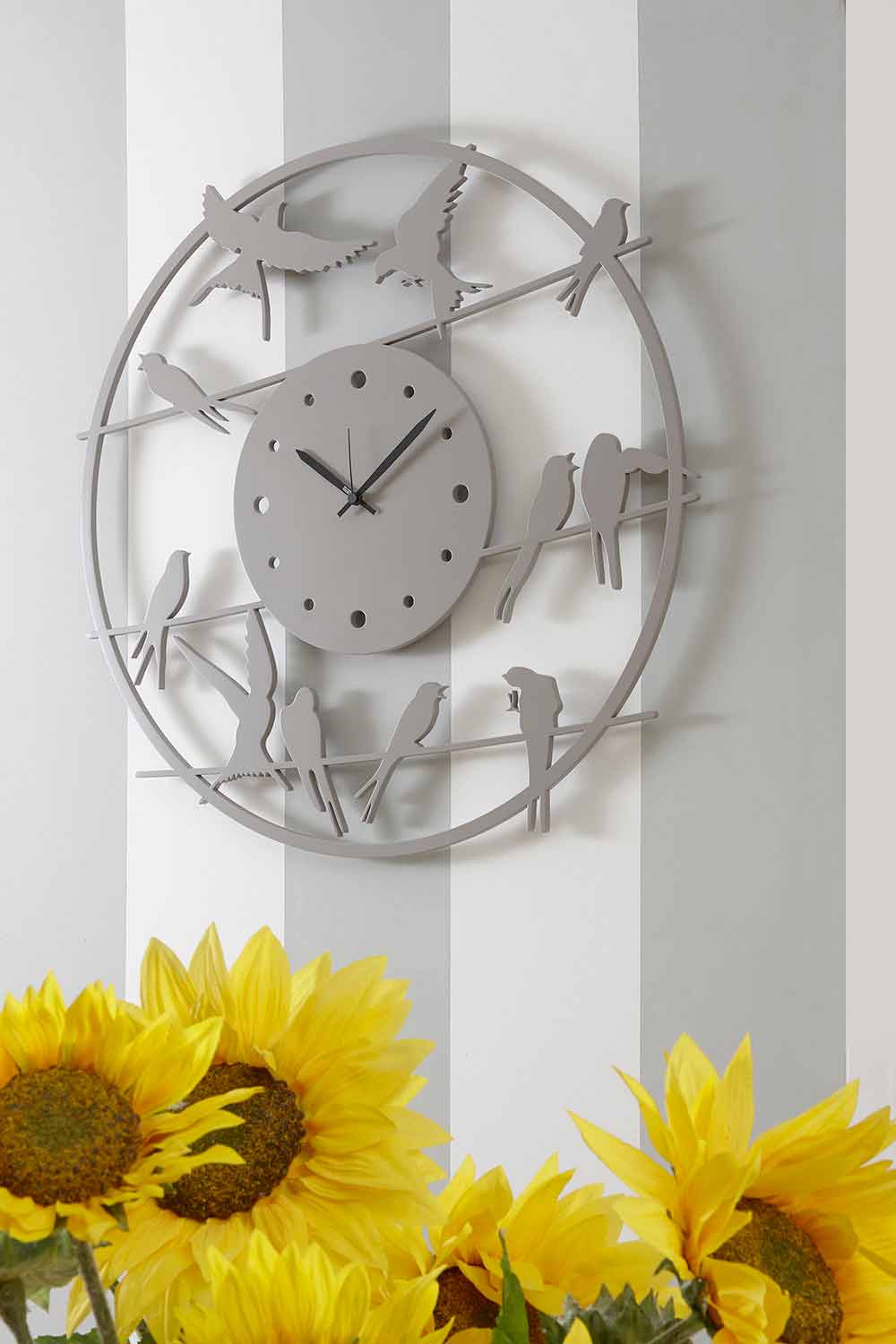 Reloj de pared grande y original, de diseño redondo y moderno con pájaros, en madera blanca, gris pardo o gris fabricado en Italia.