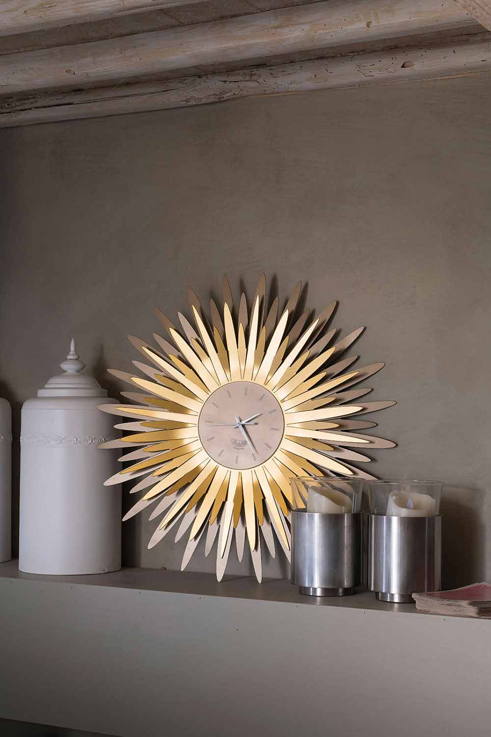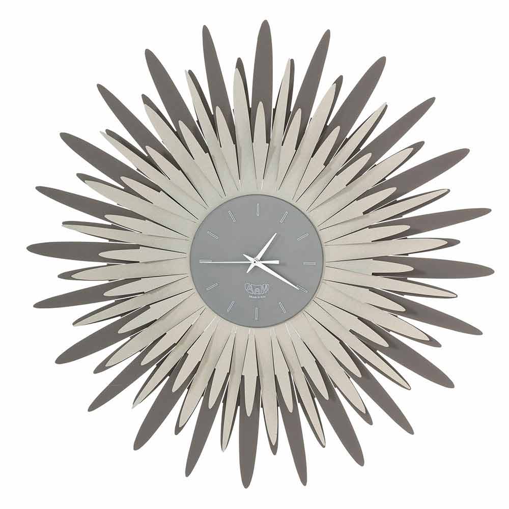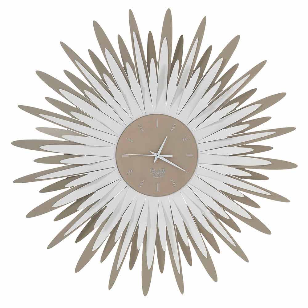reloj de pared armonioso caracterizado por numerosos y brillantes rayos de sol alrededor de la esfera.