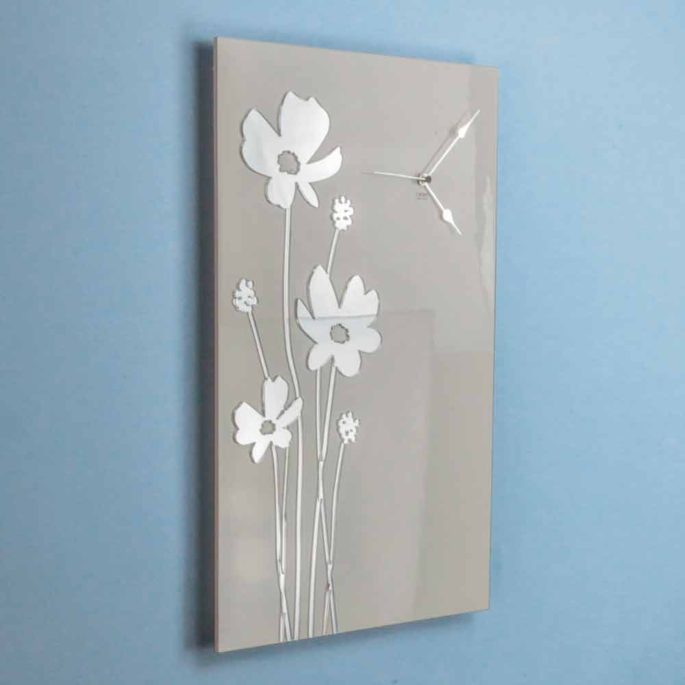 Reloj de pared rectangular de diseño moderno en madera blanca con espejos de plexiglás con incrustaciones, hecho en Italia.