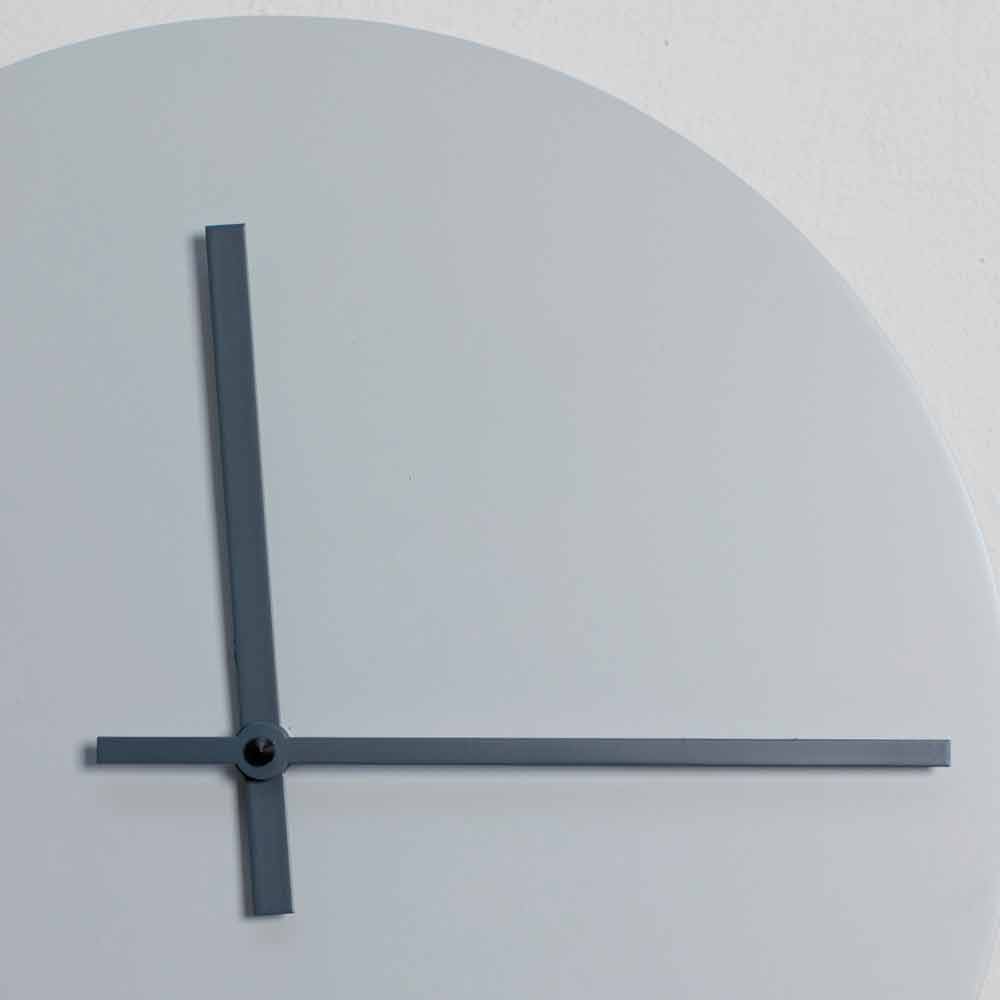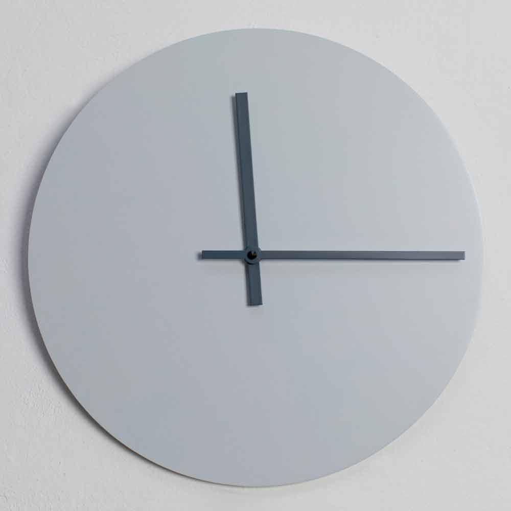 Reloj de pared en madera lacada en color gris polvo y azul ballena, moderno diseño redondo hecho en Italia.