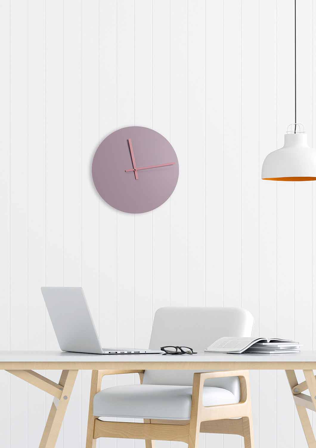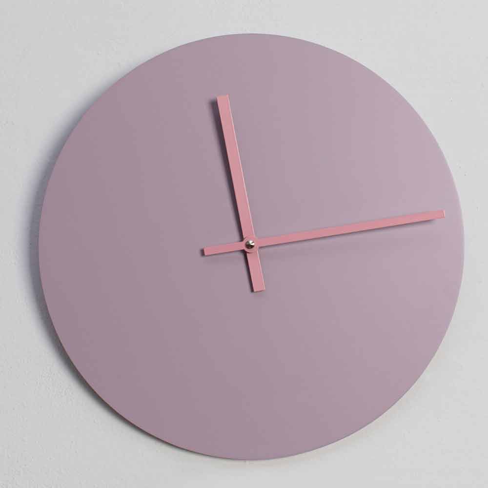 Reloj de pared redondo en color rosa, diseño moderno en madera, hecho en Italia.