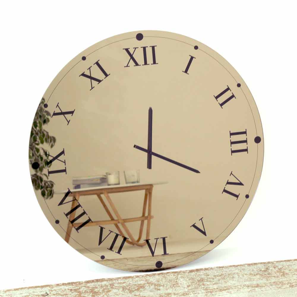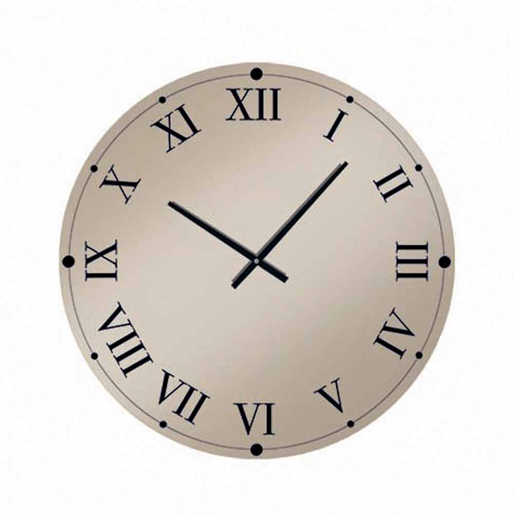 Reloj de pared redondo , fabricado en Italia , de cristal espejado con números romanos y manecillas negras.