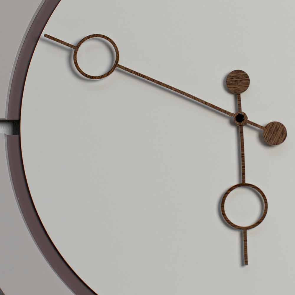 reloj redondo se crea gracias a la combinación de tres tonos de marrón: arena, beige y cacao, con agujas de nogal. Cada pieza se ajusta a otra para formar un