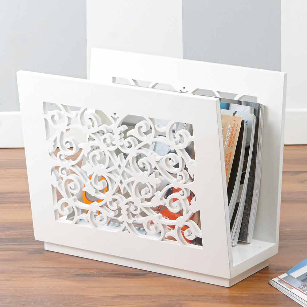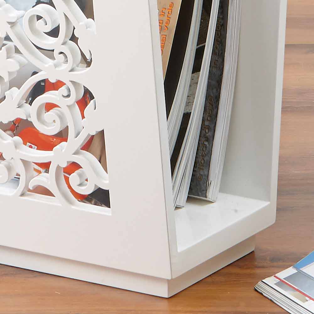 Revistero en madera blanca con forma, grava, gris paloma, arena, diseño de suelo moderno y elegante hecho en Italia.
