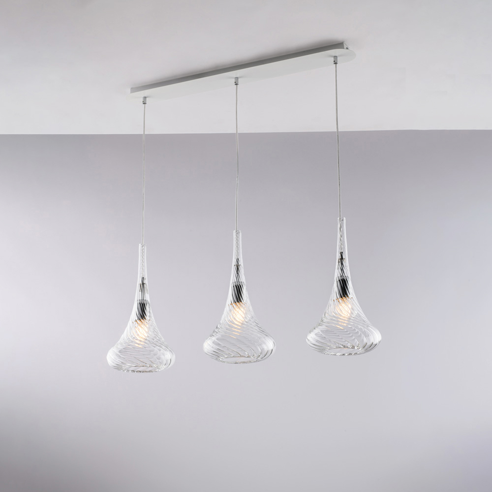 De líneas elegantes y estilizadas, esta lámpara colgante de riel de hierro artesanal con cristal Pyrex es una solución de iluminación contemporánea, ideal para quienes buscan un equilibrio entre funcionalidad y estética. Los tres difusores de cristal Pyrex , con sus formas suaves y ligeramente acampanadas, están suspendidos a lo largo de un riel horizontal, garantizando una distribución uniforme de la luz y un efecto visual armonioso.