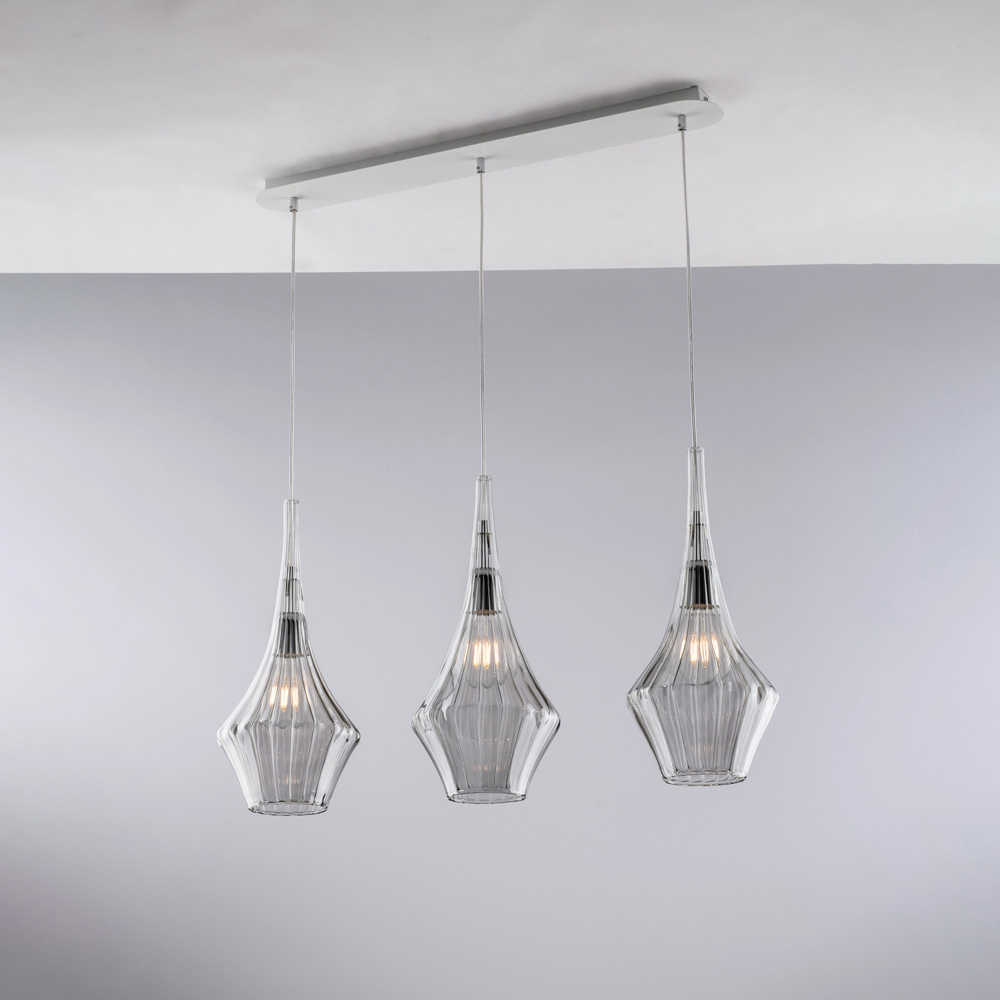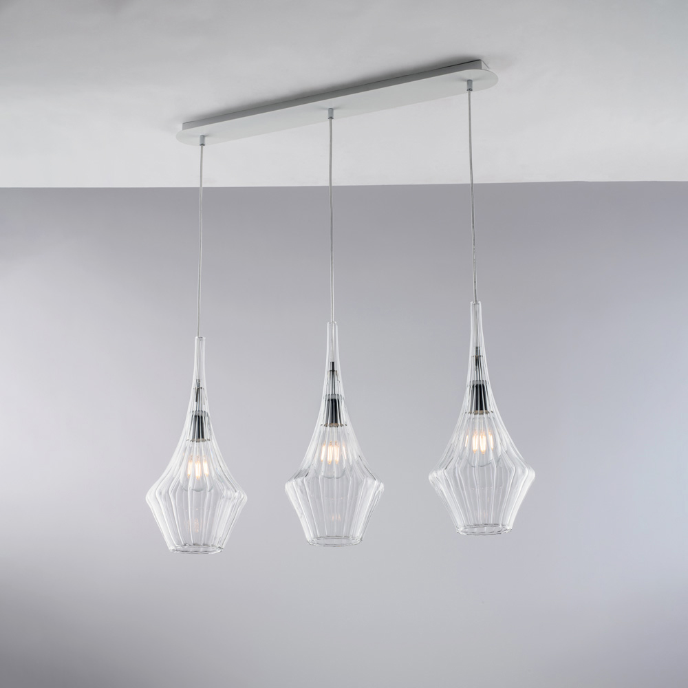 De líneas elegantes y estilizadas, esta lámpara colgante de riel de hierro artesanal con cristal Pyrex es una solución de iluminación contemporánea diseñada para realzar los espacios con equilibrio y refinamiento. Los tres difusores de cristal Pyrex , con sus formas facetadas y armoniosas, distribuyen la luz uniformemente, creando una atmósfera luminosa y sofisticada.