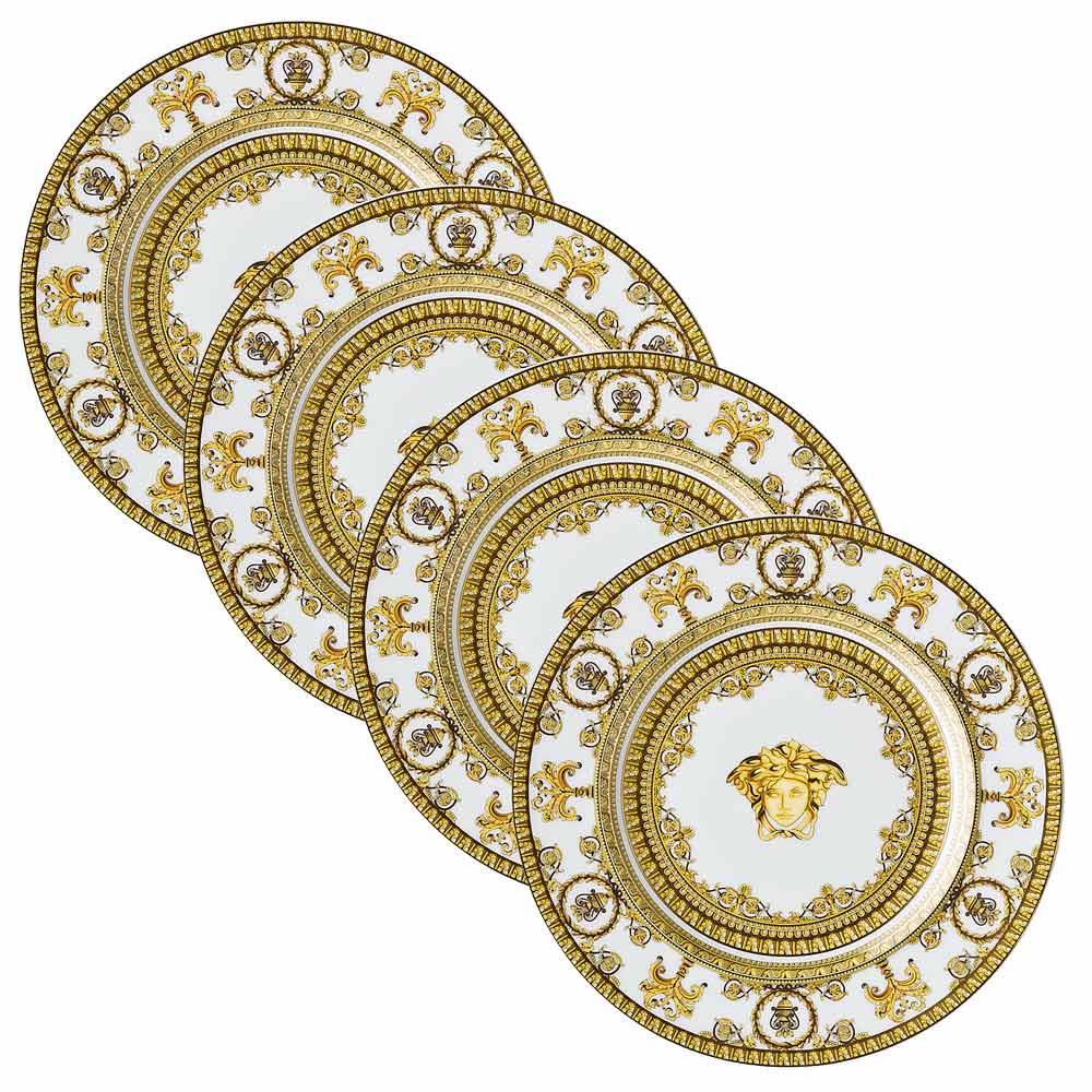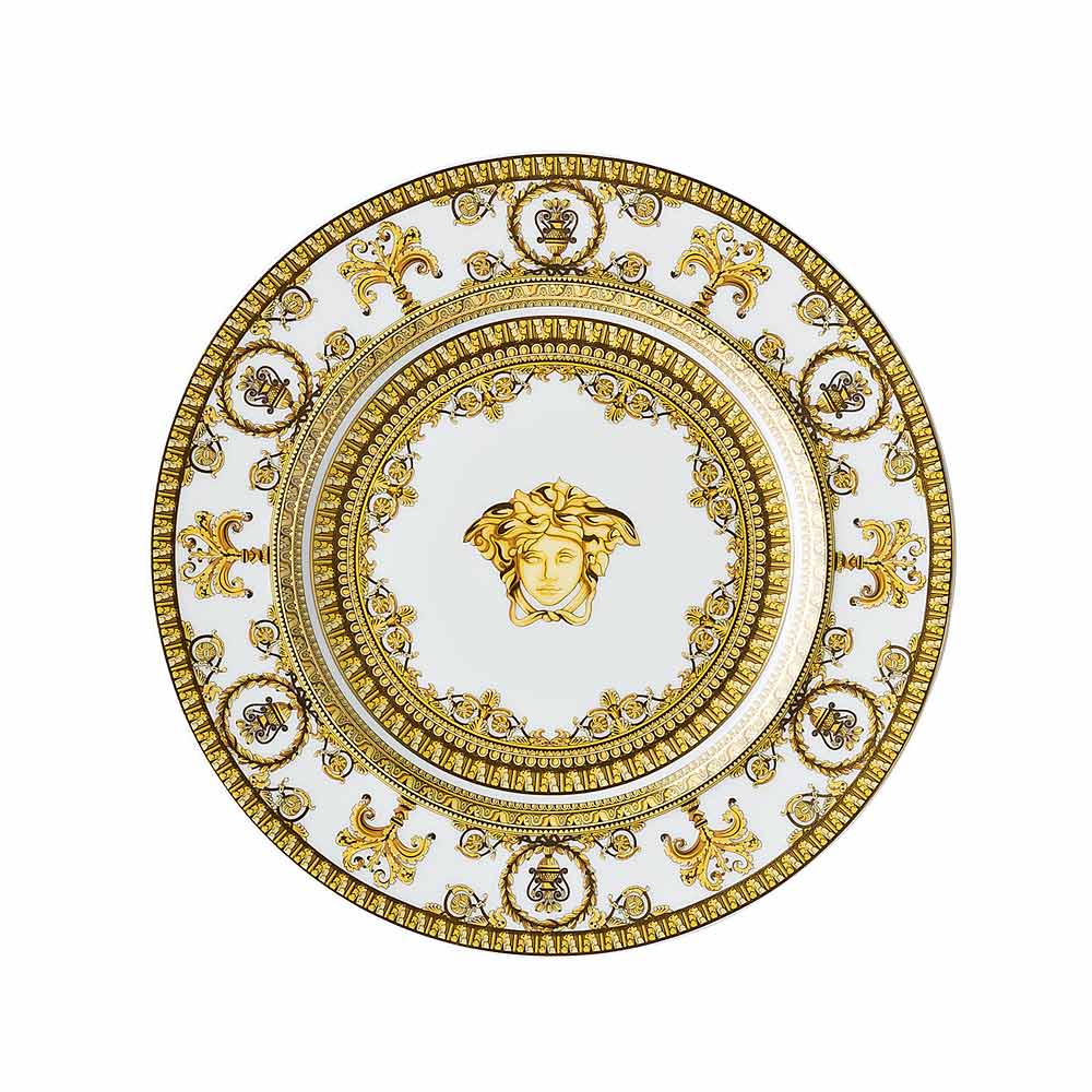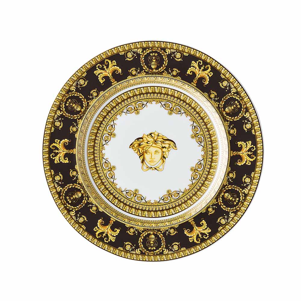 El plato de pan I Love Baroque de Versace , elaborado en porcelana fina , es una oda a la sofisticación y opulencia atemporales típicas de la casa. El intrincado diseño presenta motivos barrocos dorados que se entrelazan elegantemente sobre un fondo negro o blanco, creando un contraste que realza la icónica cara de Medusa en el centro. Cada detalle es un homenaje al lujo y la artesanía de Versace .