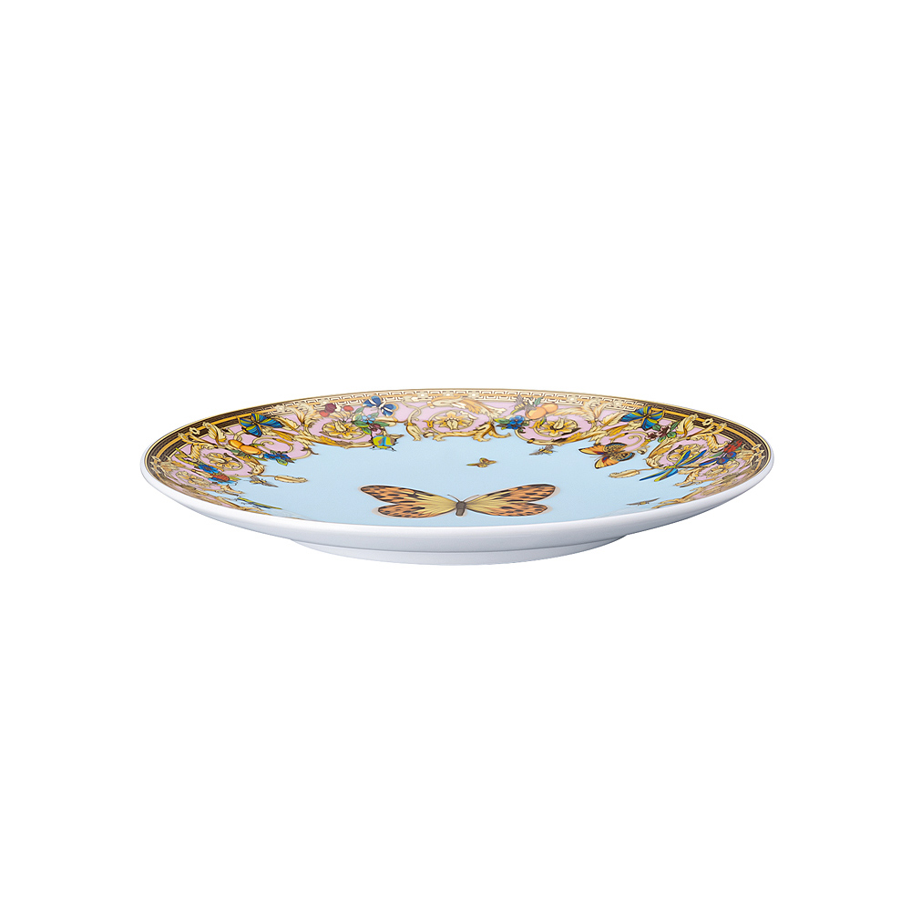 Este encantador plato de porcelana presenta un diseño brillante y colorido que llama la atención de inmediato, lo que lo convierte en una pieza de colección y una vajilla refinada. Una elegante mariposa se destaca en el centro, rodeada por un delicado borde ornamental con motivos florales y arabescos, sobre un sereno fondo azul.