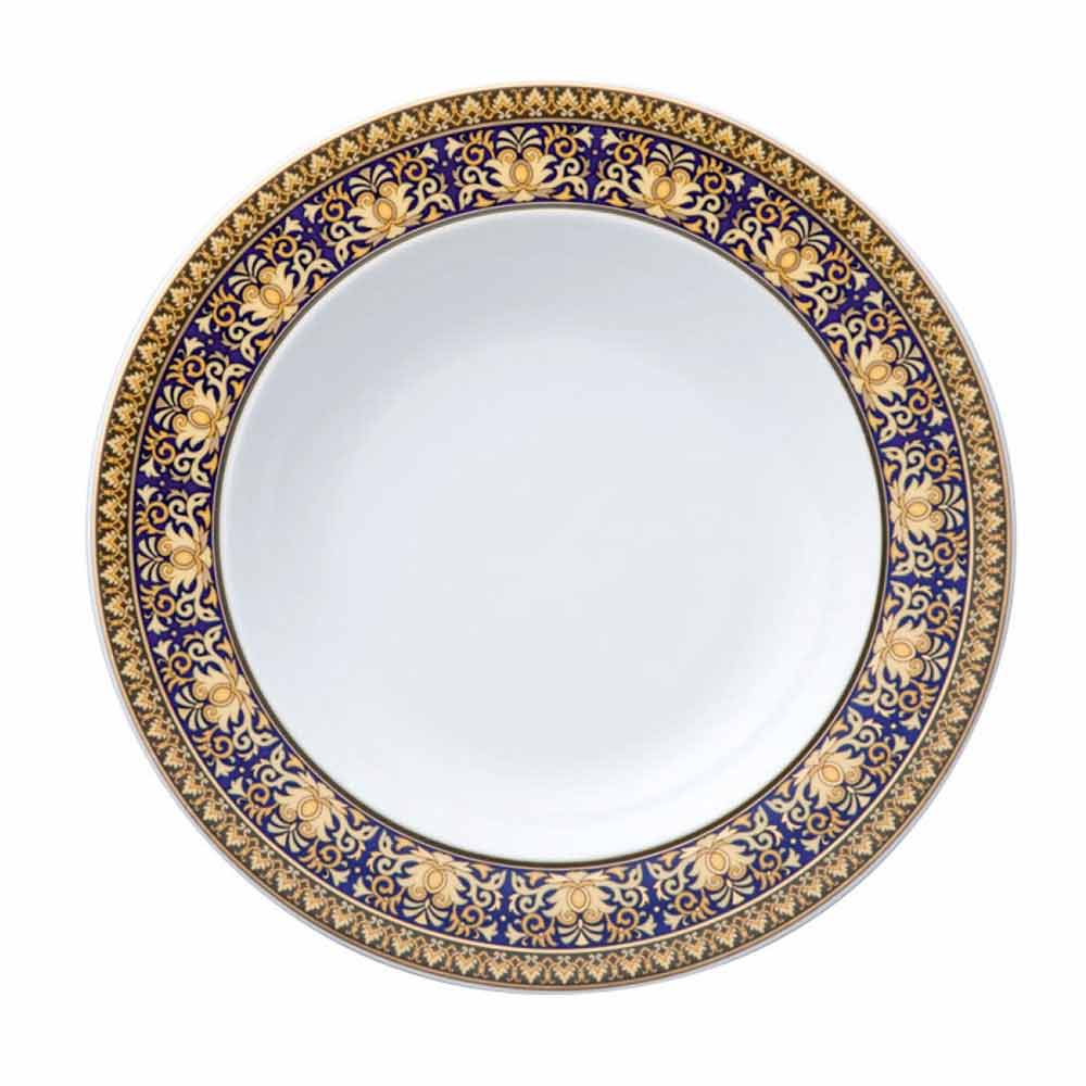 El plato hondo de porcelana de 22 cm de Versace con un diseño único es parte de la elegante colección moderna que, combinada con un glamour fascinante y refinado, recuerda épocas pasadas y se expresa en tonos de azul brillante y toma el nombre de Medusa Blue.