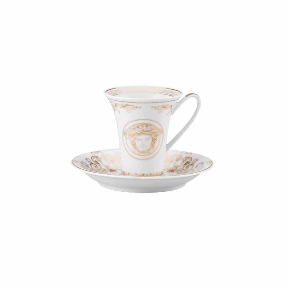La refinada y diseñada taza de café y platillo de Versace es parte de la refinada y lujosa colección de mesa Medusa Gala.