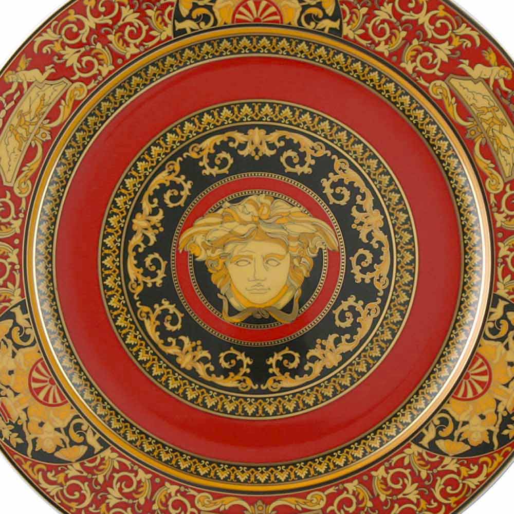 El fantástico plato de pared o de mesa Versace forma parte de la línea Medusa Rosso que se compone de dos o tres tonalidades: un elegante rojo y los muy preciosos oro y negro; que combinados forman un motivo refinado que transporta a épocas fascinantes y lejanas.