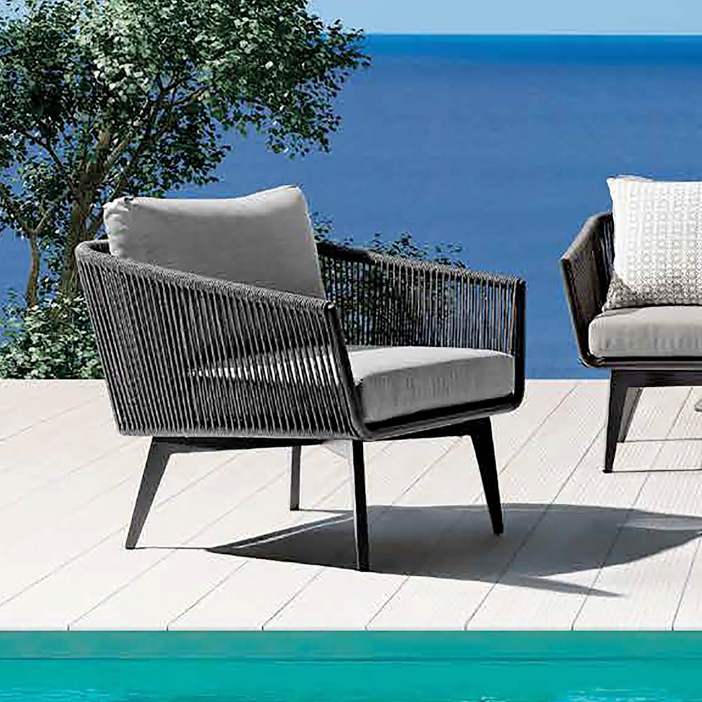 Los amplios y suaves cojines de tela para exterior ofrecen un asiento cómodo y resistente a la intemperie, perfecto para el uso diario en jardines, terrazas o entornos con vistas al mar. El tono gris de los cojines combina armoniosamente con la estructura oscura, creando un contraste elegante y relajante.