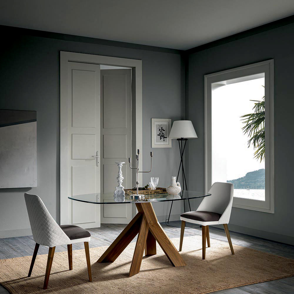 Mesa de comedor de cristal y patas de madera contrachapada fabricada en Italia.