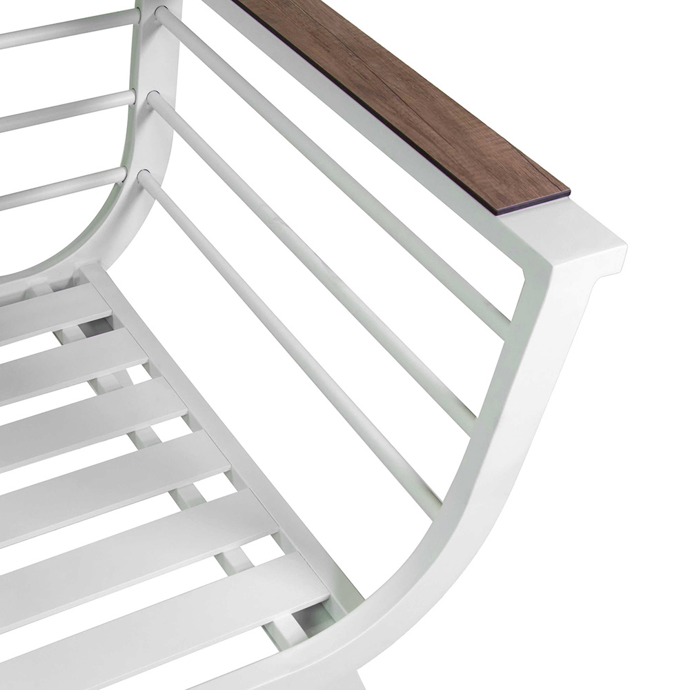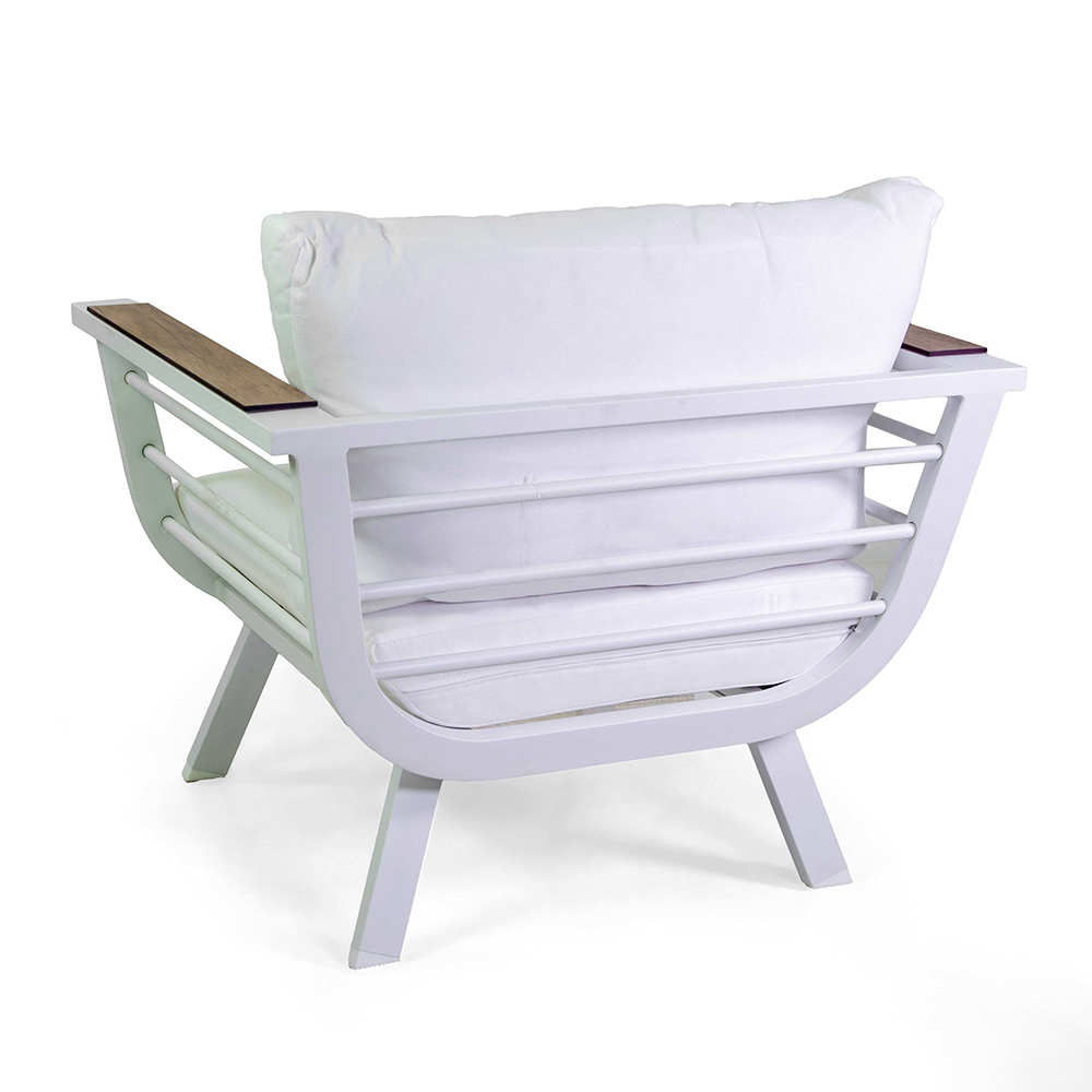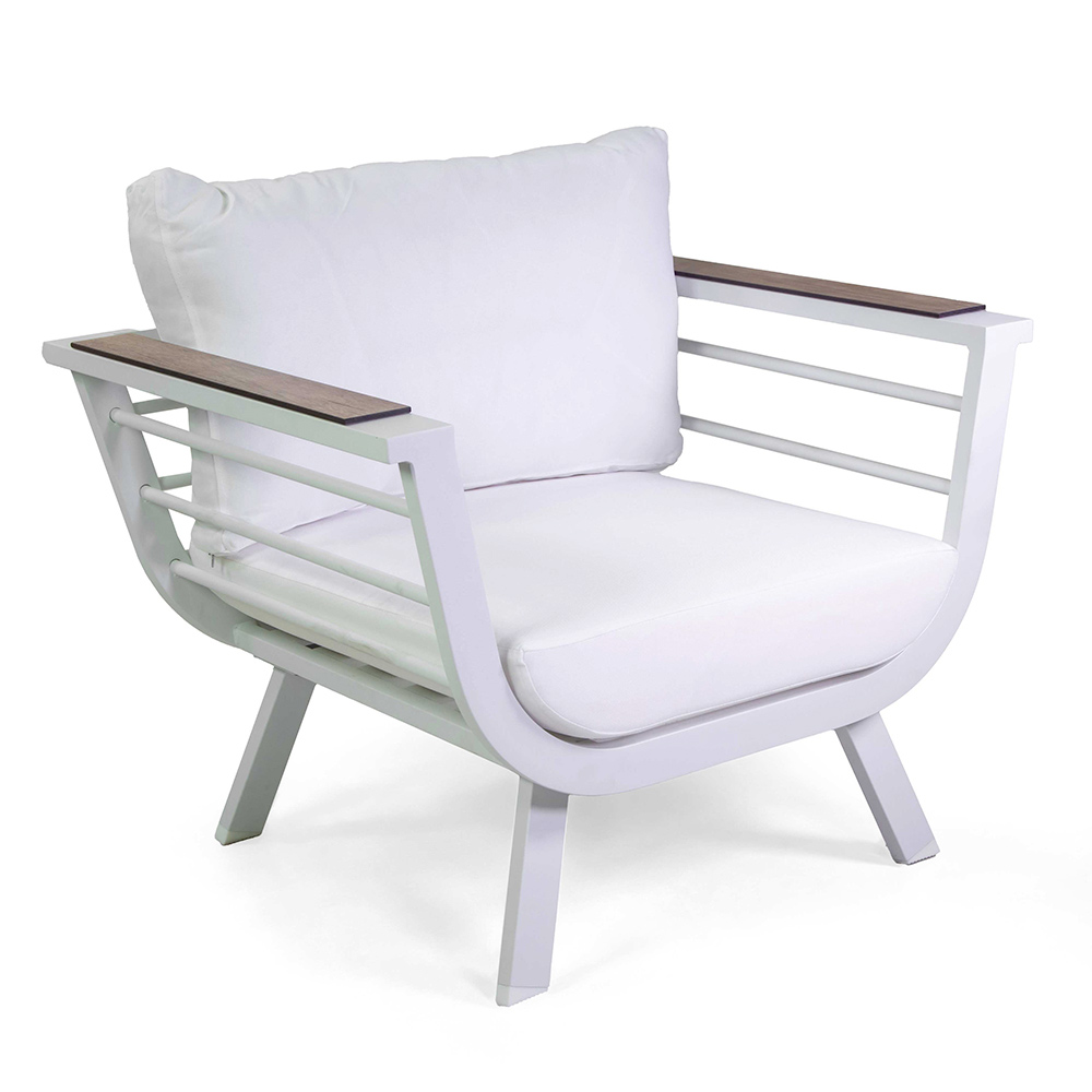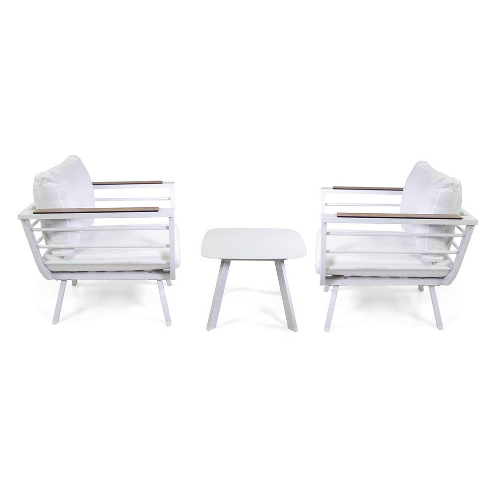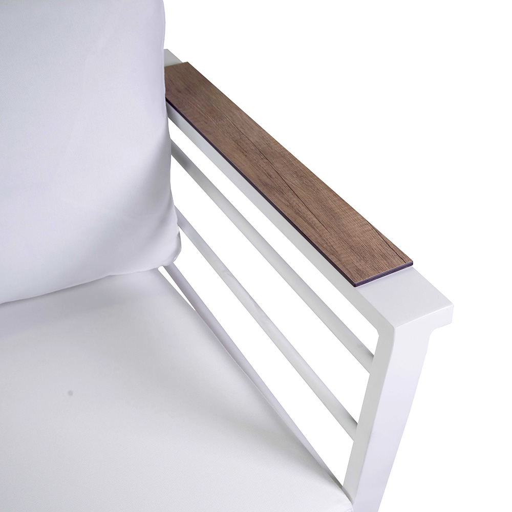 Descubre la elegancia moderna y la comodidad con este conjunto de salón de aluminio con recubrimiento en polvo en blanco . Perfecto para añadir un toque de clase a su espacio al aire libre, este conjunto incluye dos sillones con cojines extraíbles de 12 cm de grosor en tejido Olifen 100% repelente al agua, garantizando comodidad y durabilidad. Los apoyabrazos de HPL añaden un toque de estilo y practicidad, mientras que la mesa con tablero de aluminio blanco es resistente y fácil de mantener.