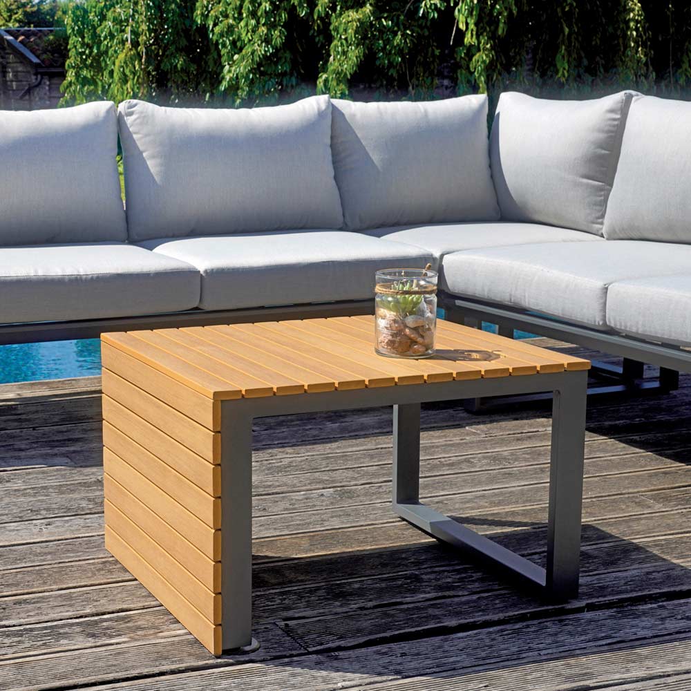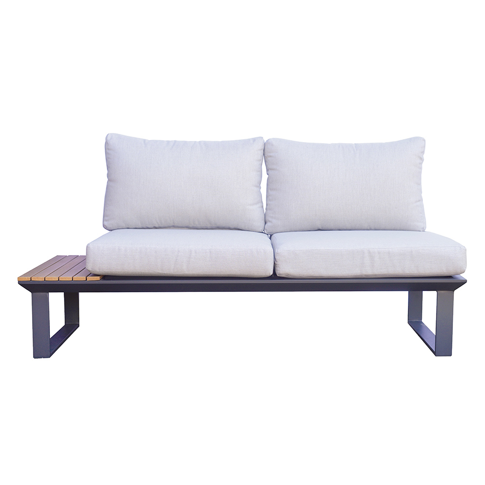 Conjunto de salón de exterior compuesto por 2 sofás de 2 plazas y un sofá rinconera fabricados en aluminio antracita y con cojines desenfundables en color gris . Los sofás de 2 plazas están equipados con mesitas auxiliares y también se incluye la mesa central , todo ello fabricado con estructura de aluminio antracita y sobre de madera de resina.