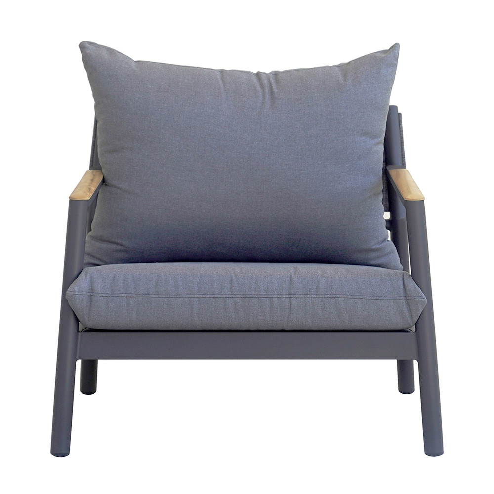 Conjunto de salón de exterior compuesto por 2 sillones y un sofá de tres plazas realizado con estructura de aluminio antracita y reposabrazos de teca con cojines grises extraíbles y almohada con acabado ladrillo y fresno. También se incluye una mesa de centro con tapa de cristal cerámico efecto pizarra y estructura de aluminio.
