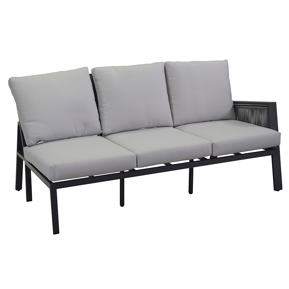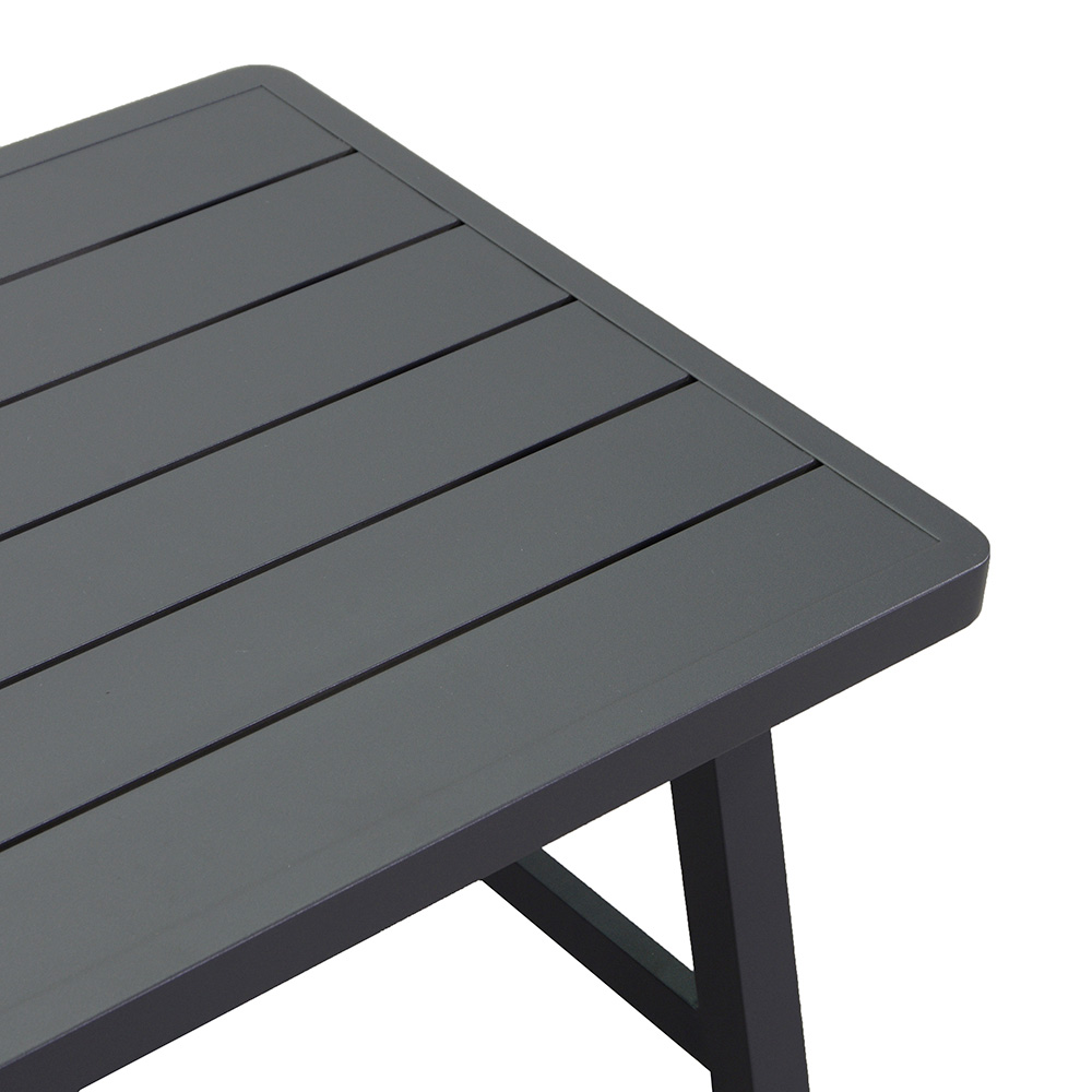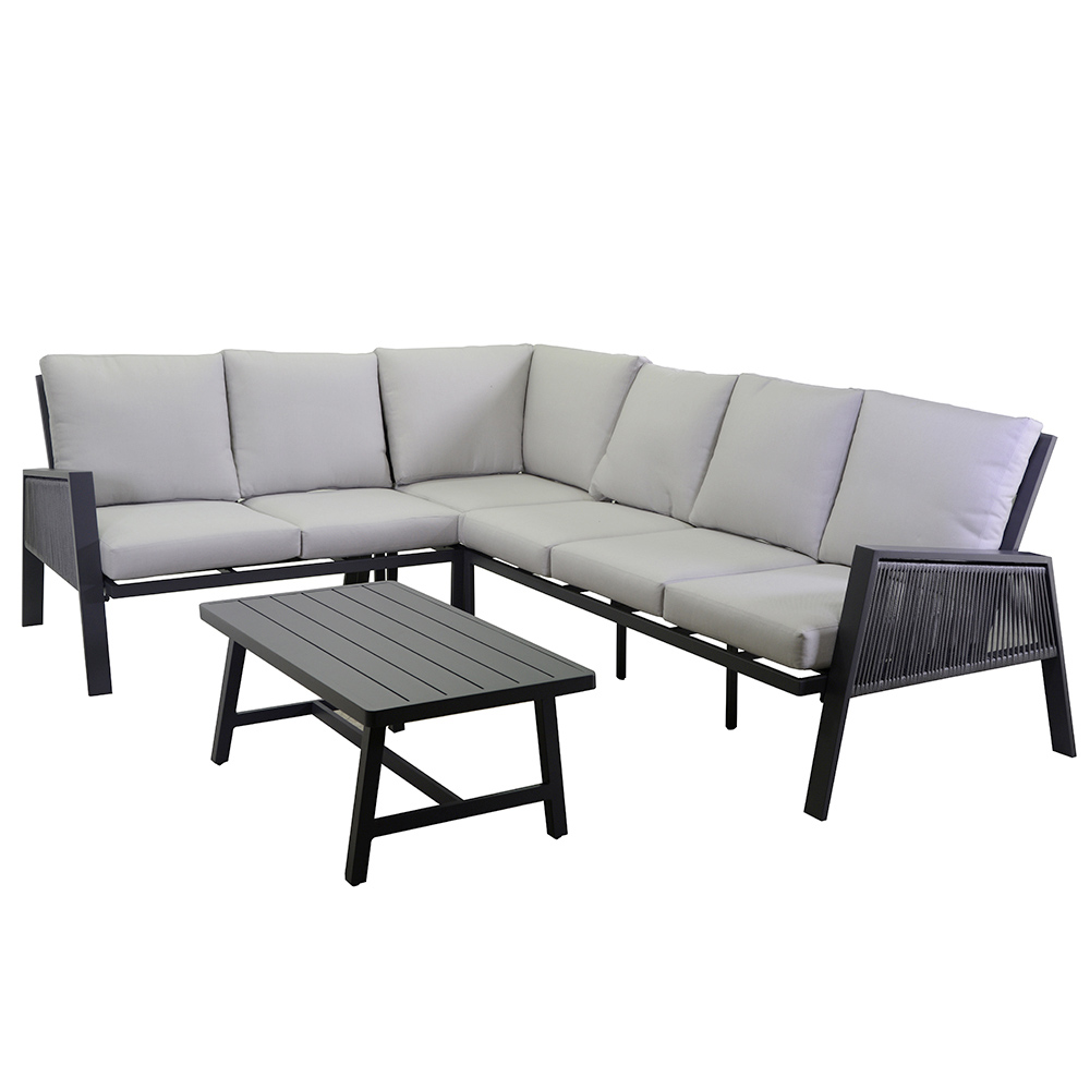 Los cojines de olefina 100% gris claro, hidrófugos, desenfundables y de fácil mantenimiento, garantizan el máximo confort para largos ratos de relax al aire libre. Completado con una mesa con encimera de aluminio , este salón no sólo es práctico sino también estéticamente agradable, combinando funcionalidad y estilo en una única solución de mobiliario de exterior.