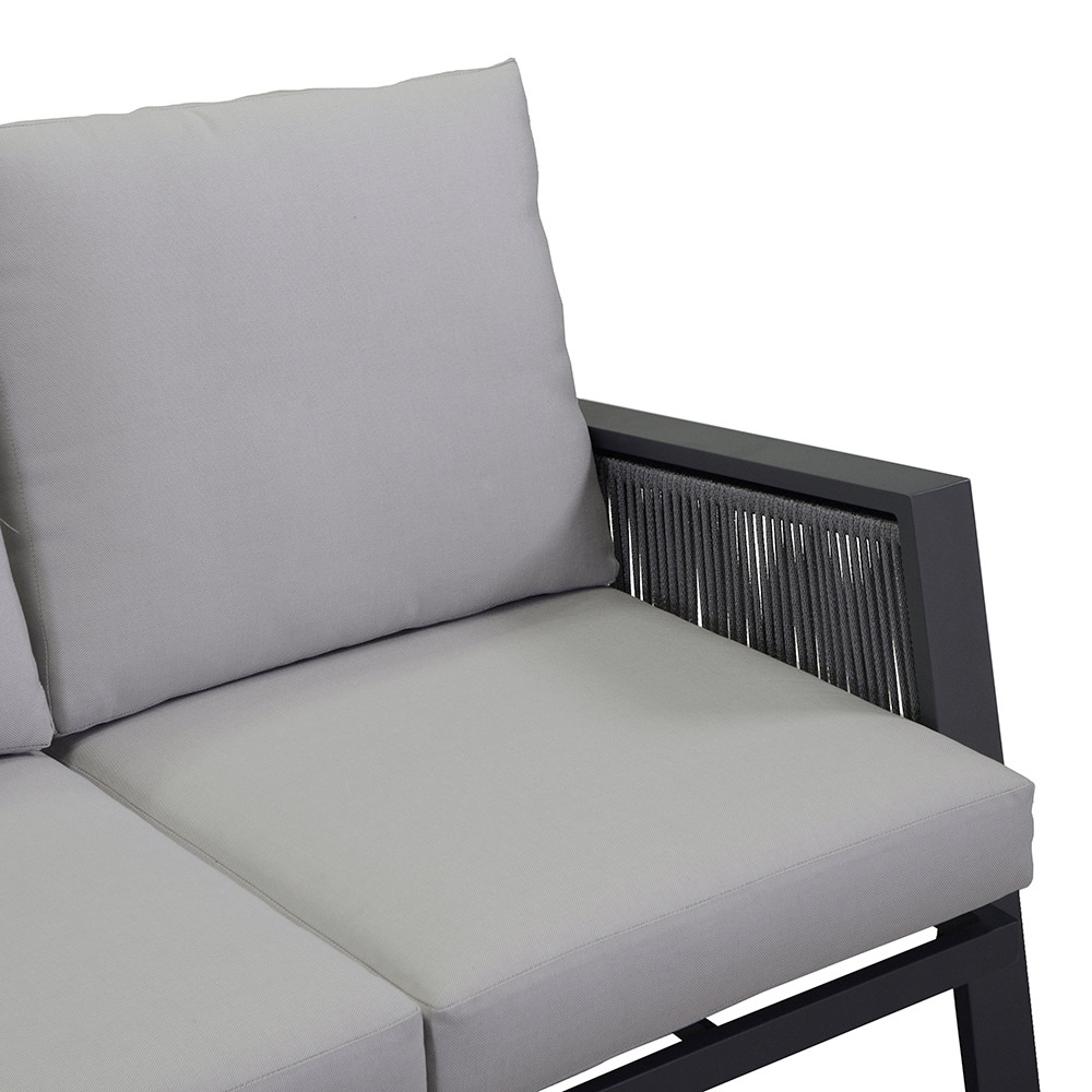 Este elegante Conjunto de salón de jardín es ideal para quienes buscan un espacio exterior refinado y confortable. Con un marco de aluminio antioxidante en color antracita, este conjunto ofrece durabilidad y estilo, soportando los elementos con gran facilidad. Las cuerdas de textileno gris claro le confieren un diseño moderno y desenfadado, perfecto para crear un ambiente acogedor en su jardín o terraza.