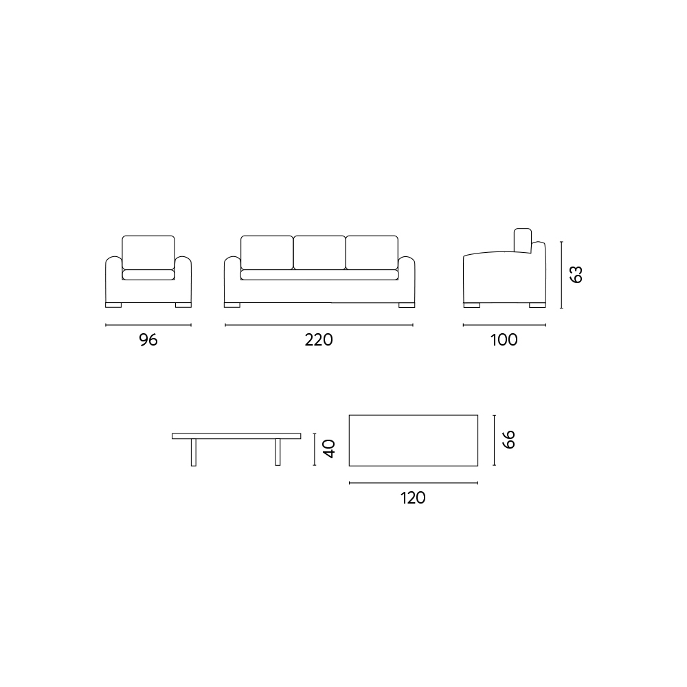 - sofá: L 220 x P 100 x H 63 cm;