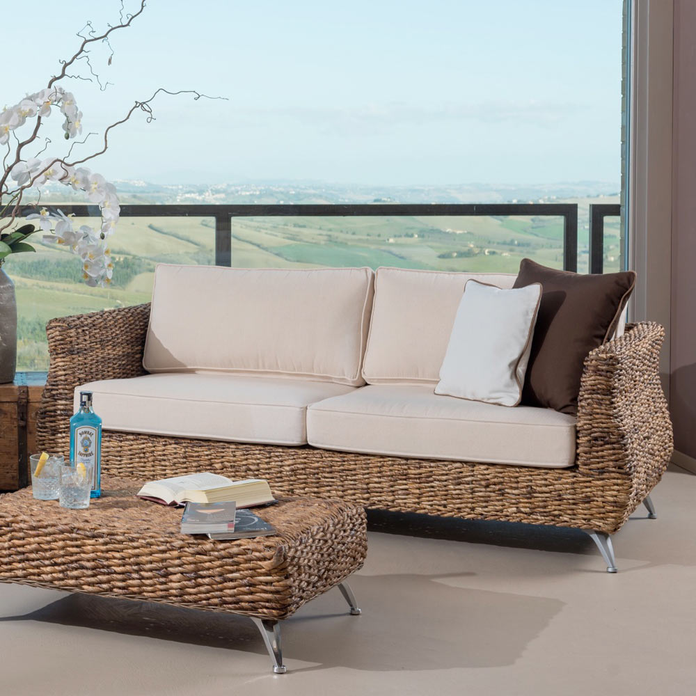 Salón de exterior compuesto por sofá de 2 plazas , sofá de 3 plazas y mesa de café-pouf en mimbre plátano natural tejido a mano con cojines estándar incluidos en el acabado estándar Ecru.