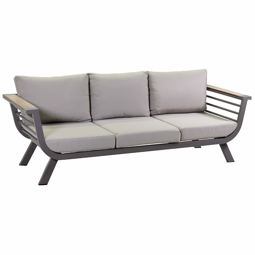 1 sofá : estructura de aluminio con recubrimiento en polvo, cojín de asiento y respaldo en tejido de poliéster 100% hidrófugo de 240g/m de grosor 12cm