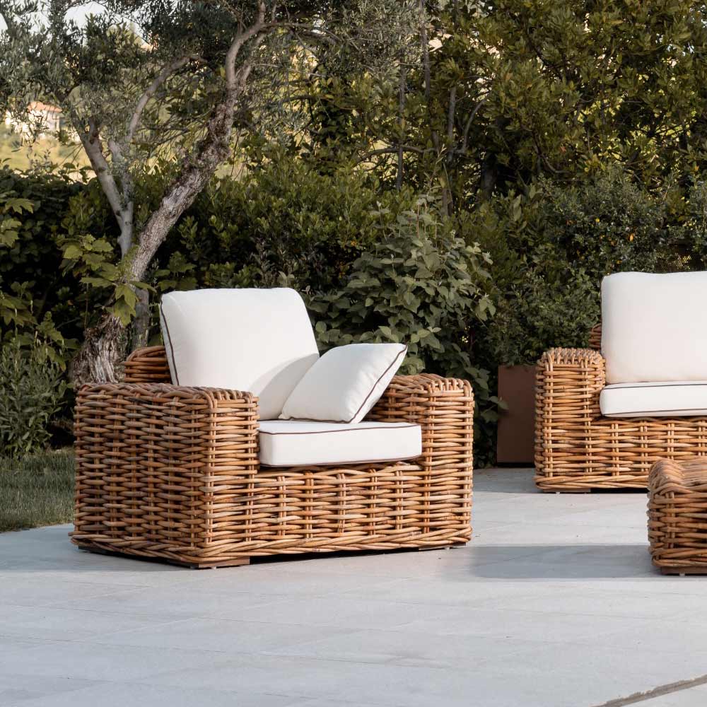 Set de salón de exterior de ratán natural con cojines incluidos.