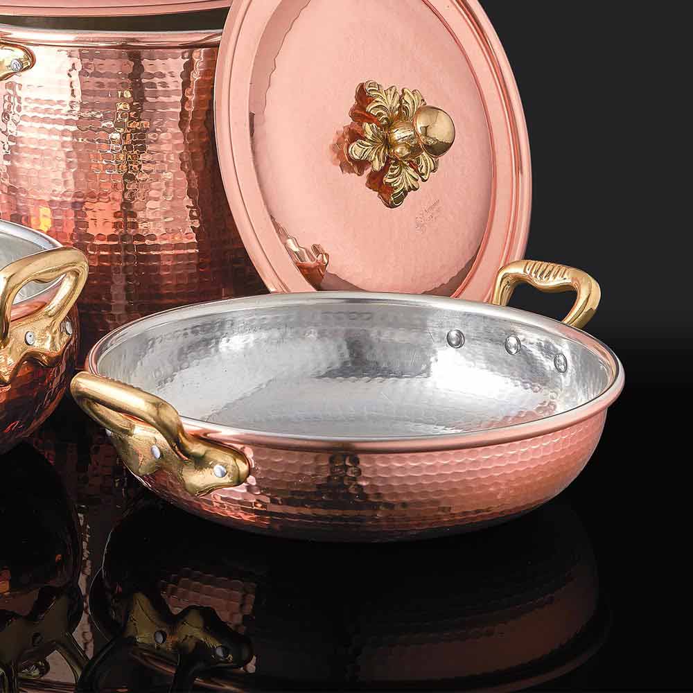 Sartén redonda de cobre macizo estañado martillado a mano y tapa, fabricada en Italia.