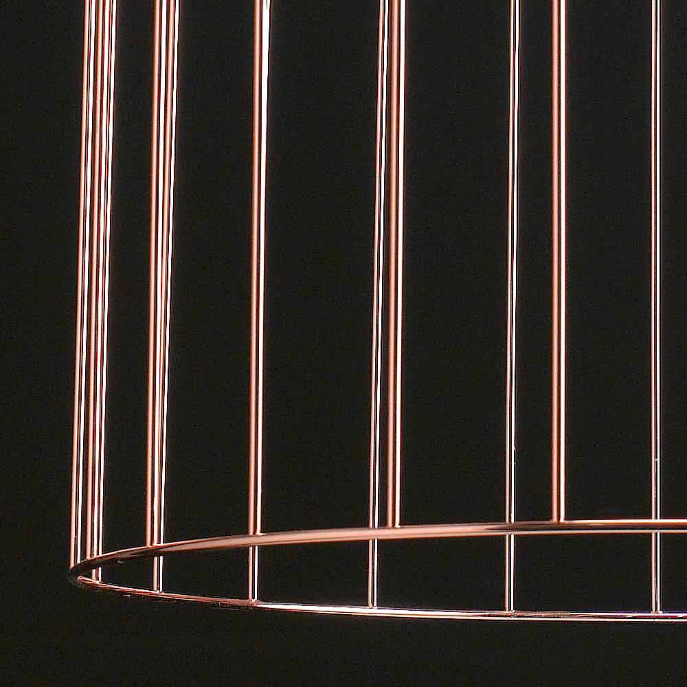 Kluvì es una colección de tres suspensiones y Te lámparas de apoyo, que pueden alcanzar un tamaño considerable, que consiste en una jaula de metal y una esfera de vidrio soplado de color blanco lechoso. Acabado: cobre pulido; preparado para el 'utiizzo 1 70W bombilla - E14.