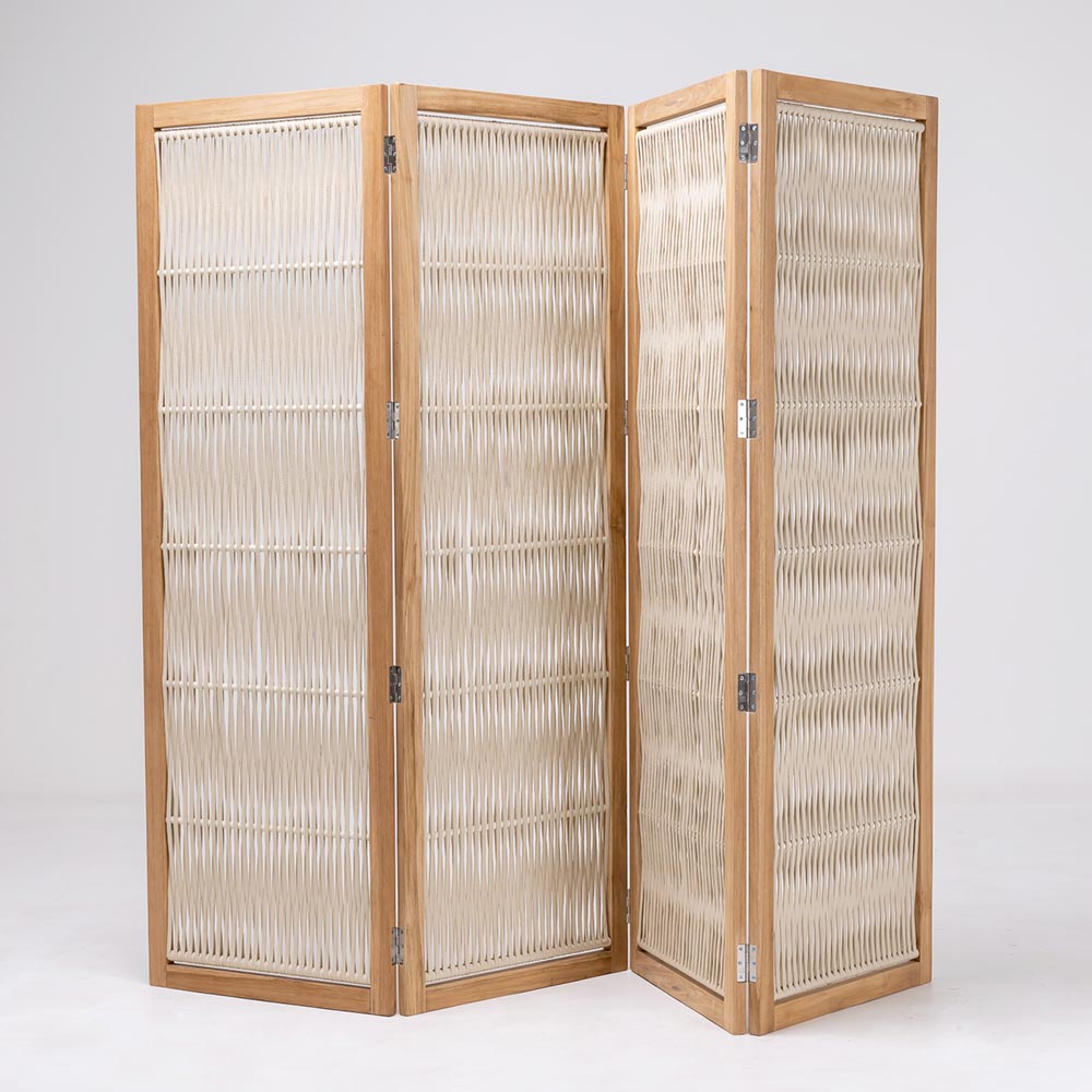 El color y la textura abierta de los paneles permiten que la luz se filtre suavemente, creando sombras que añaden un ambiente relajante y acogedor a tu espacio. Gracias a sus sólidas bisagras, este separador de ambientes es fácilmente adaptable a diferentes ángulos, permitiéndole personalizar la zona según las necesidades del momento.