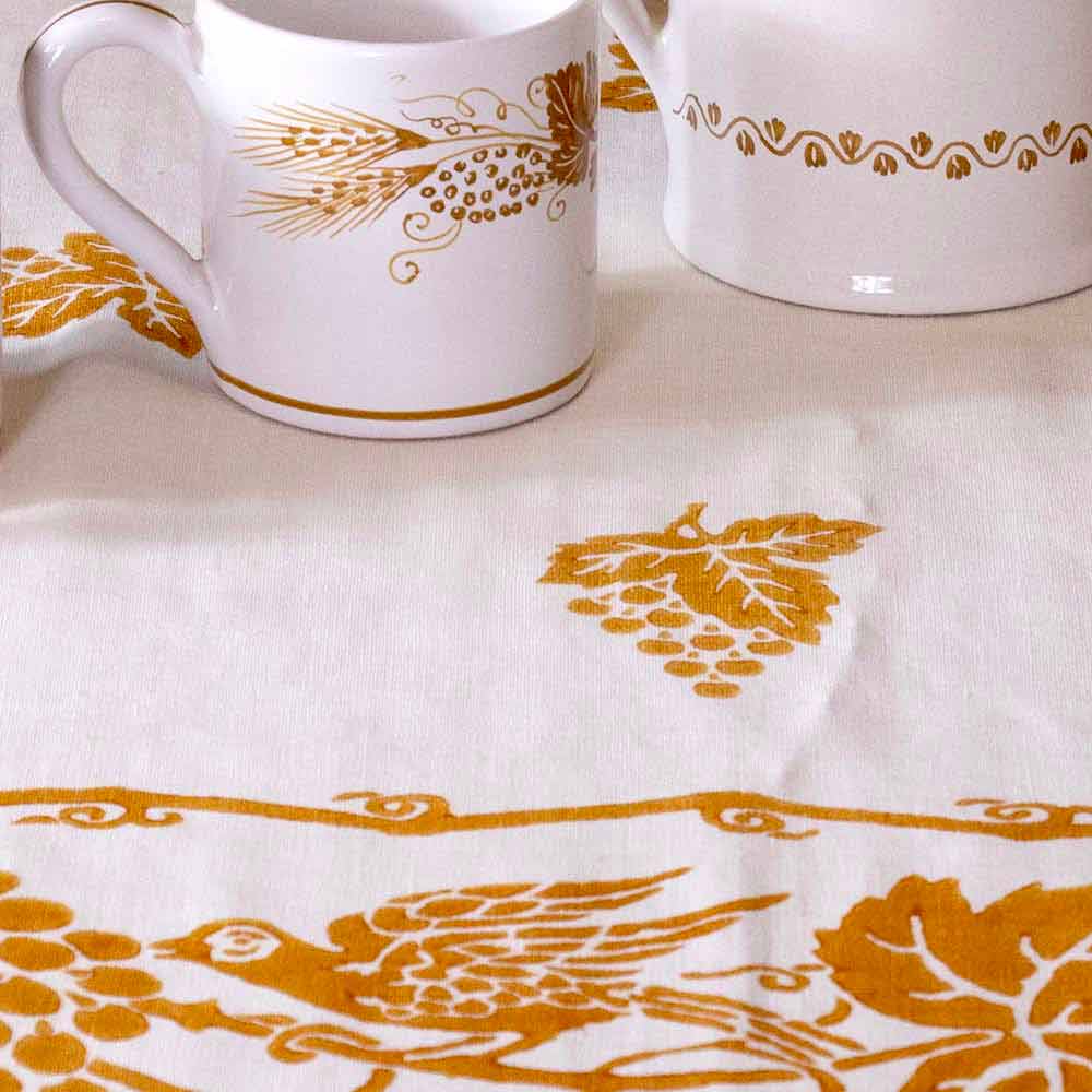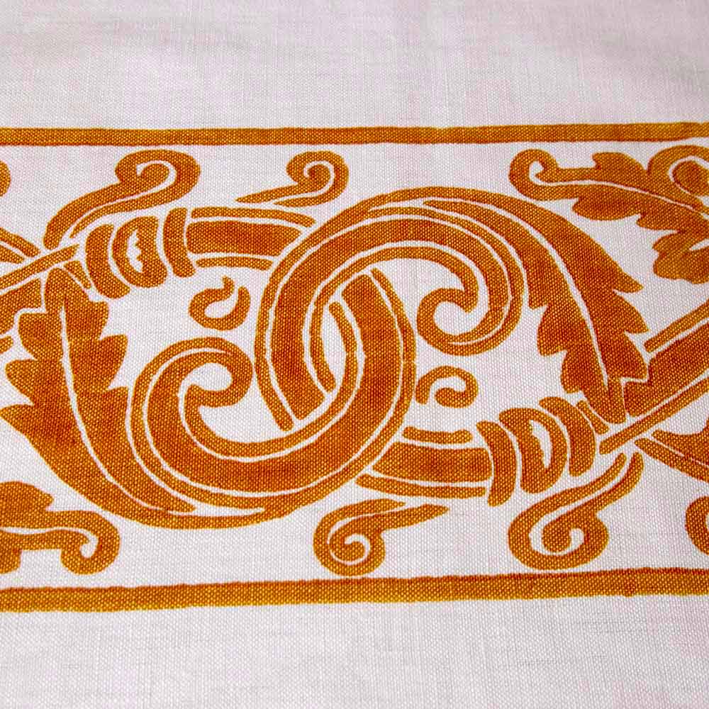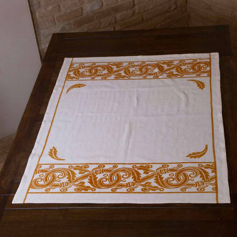 Servicio de desayuno artesanal (mantel individual y 2 servilletas) de lino puro con estampado artístico sobre telas antiguas decoradas a mano, disponible en tres variantes, una pieza única de calidad hecha en Italia.