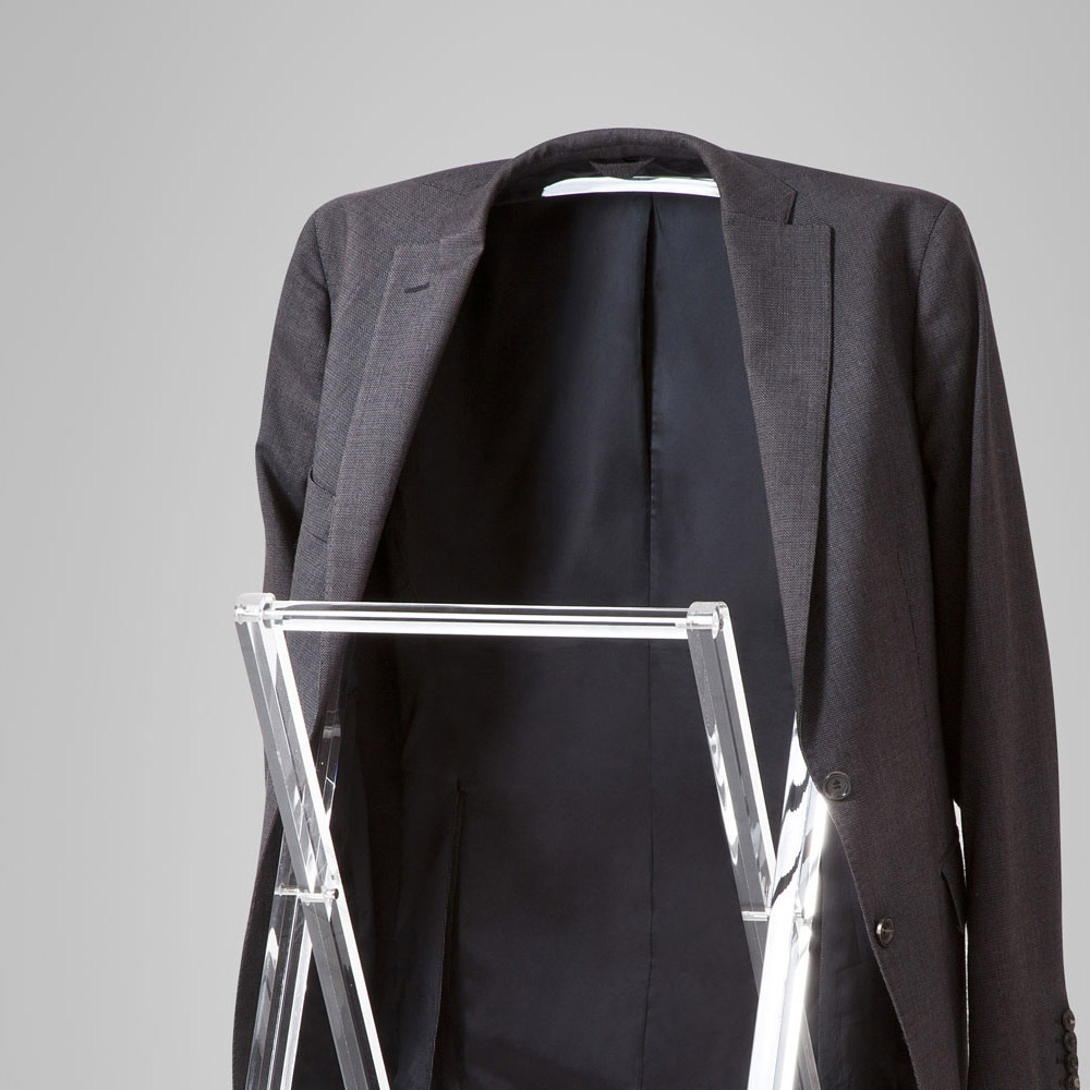 Perchero valet plegable en cristal acrílico transparente fabricado en Italia.