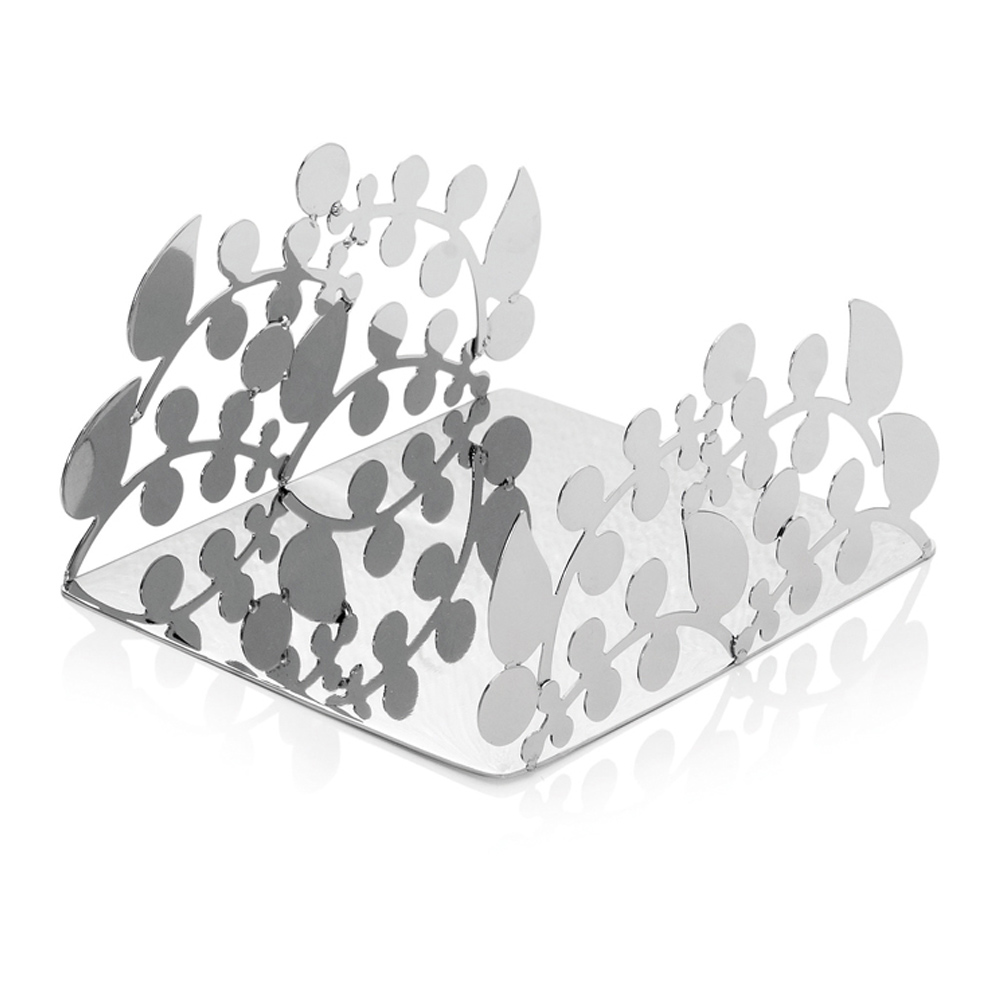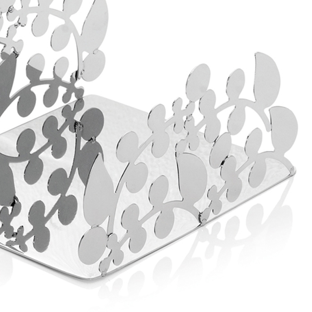 Este servilletero presenta un sofisticado y elegante diseño rectangular , íntegramente realizado en metal plateado con decoraciones naturalistas.